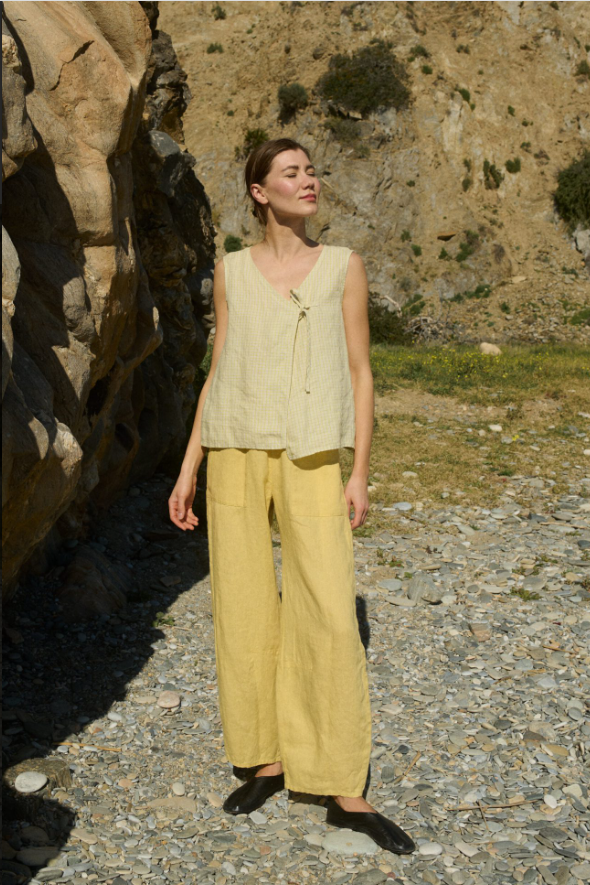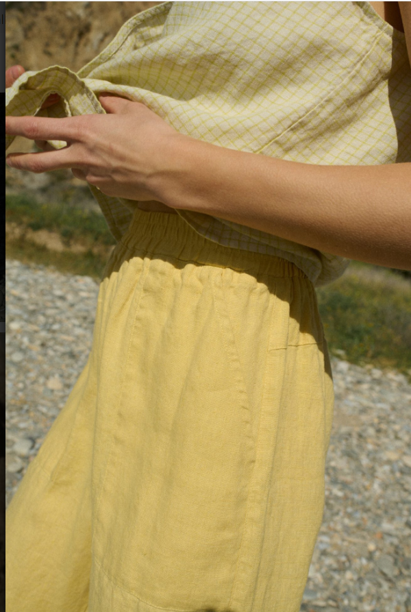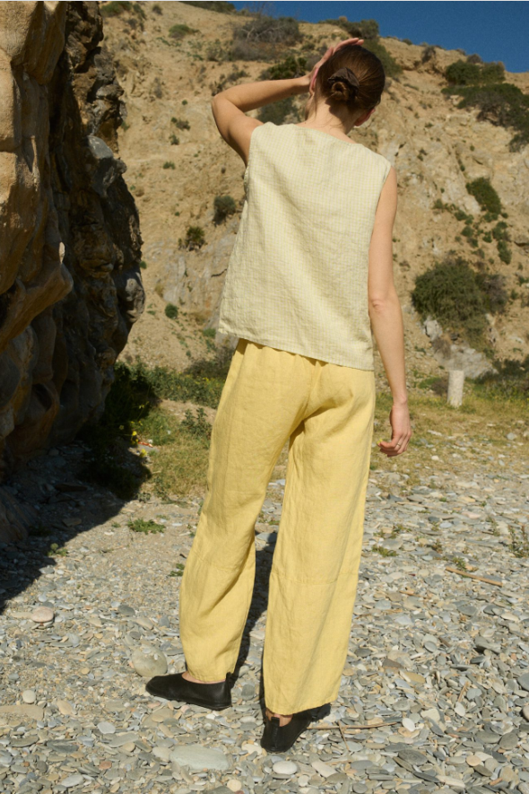 The Barrel Pants – Clarie are a testament to thoughtful design and timeless style. The barrel – shaped cut is masterfully crafted, gently widening from the waist down to create a flattering, flowing silhouette that drapes elegantly over the legs. This unique shape not only offers freedom of movement but also flatters various body types, giving the wearer a sense of poise and grace.Every detail of these pants is carefully considered. The waistband is designed for a comfortable fit, ensuring that the pants stay in place without feeling restrictive. The neatly stitched pockets are both functional and stylish, providing a convenient place to store small essentials while maintaining the clean lines of the pants. The warm yellow fabric has a lovely texture, soft to the touch and breathable, making it perfect for hot days.Whether paired with the matching checkered sleeveless top for a coordinated look or with contrasting pieces to create a bold statement, the Barrel Pants – Clarie combine delicate details with a relaxed fit. They bring a touch of understated sophistication to any outfit, making them a cherished piece for those who appreciate refined yet comfortable fashion.