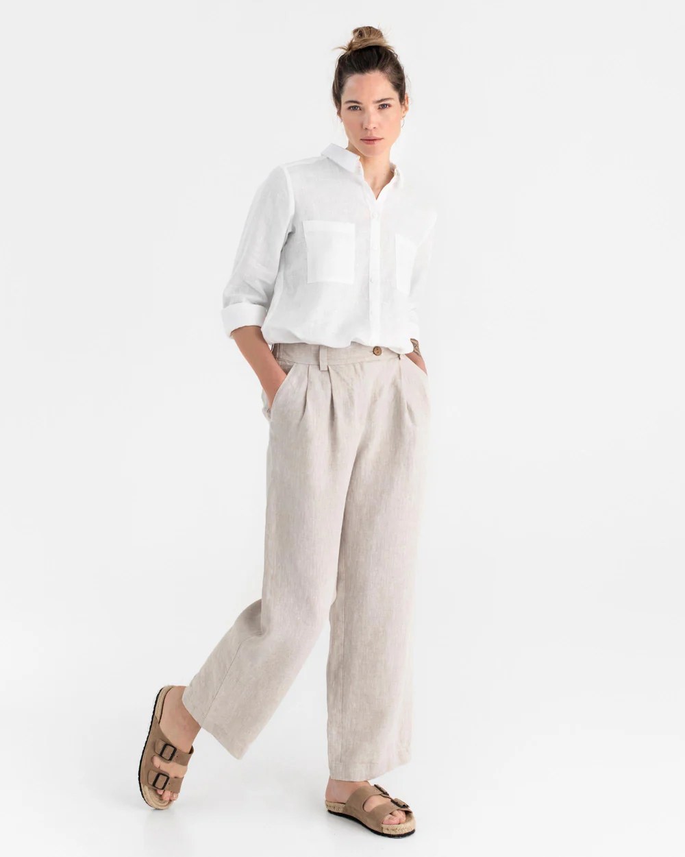 The beige linen wide – leg trousers are a charming piece that seamlessly combines casual comfort with subtle elegance. Their wide – leg fit is crafted to offer a sense of ease while still maintaining a flattering shape. The linen fabric, with its inherent breathability and soft touch, not only keeps you cool in mild temperatures but also adds a hint of natural texture and refinement. The button and zipper closure at the front is a notable feature, providing a secure fit and a polished, put – together look.Small details enhance their appeal: the neatly finished hems, the fine texture of the linen fabric, and the graceful drape all contribute to a sophisticated appearance. The beige color is versatile and timeless, pairing effortlessly with a wide range of tops. For a laid – back weekend outfit, pair them with a plain white linen tee, a denim jacket, and sneakers. To elevate the style for a casual office setting, opt for a light blue button – down shirt, a slim leather belt, and loafers.When it comes to layering, these trousers work well too. On cooler days, pair them with a lightweight knit cardigan or a tailored blazer, and the wide – leg design ensures they still fit comfortably and look stylish. No matter how you choose to wear them, these trousers’ comfortable fabric, versatile design, and charming details make them an essential addition to any wardrobe, capable of transforming simple outfits into effortlessly stylish ensembles suitable for both daily wear and casual outings.