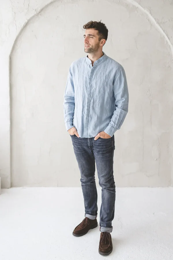 The blue linen short – sleeve shirt is a masterful creation that seamlessly combines timeless simplicity with contemporary comfort. Its silhouette is intentionally relaxed, offering a sense of ease without appearing sloppy. The linen fabric, with its natural texture and inherent breathability, not only keeps you cool on sunny days but also imparts a touch of laid – back sophistication. The classic pointed collar and full button – down front are key elements that lend a polished look, while the chest pocket adds a subtle, functional detail.Small details enhance its allure: the precise stitching along the seams ensures durability and a neat finish, and the slightly curved hem adds a touch of elegance. The crisp white color is incredibly versatile, evoking a sense of freshness and purity, and it pairs seamlessly with a wide range of bottoms, from tailored trousers and chinos to denim shorts or linen pants for a more coordinated ensemble.When it comes to styling, this shirt opens up a world of possibilities. For a casual daytime look, pair it with light – wash denim shorts and canvas sneakers — the linen shirt adds a touch of refinement to the relaxed outfit. For a smarter casual setting, tuck it into tailored chinos and finish with leather loafers for a polished yet approachable vibe. On beach vacations, wear it open over a swimsuit with drawstring linen pants and sandals for an effortlessly chic resort look. No matter how you choose to style it, this shirt’s comfortable fabric, versatile design, and refined details make it a must – have in any summer wardrobe, capable of elevating even the simplest pieces into a stylish statement.