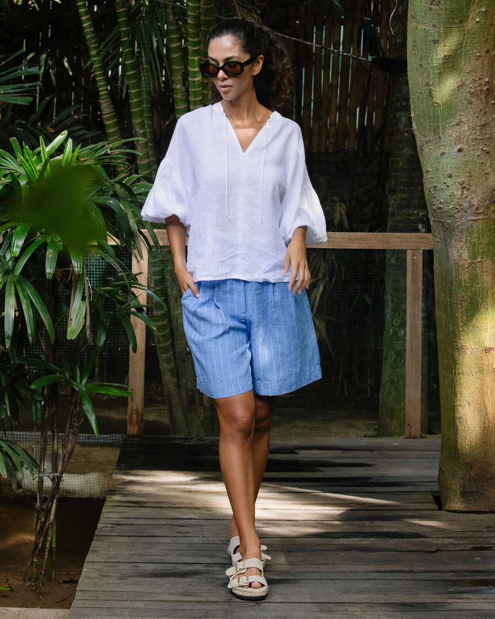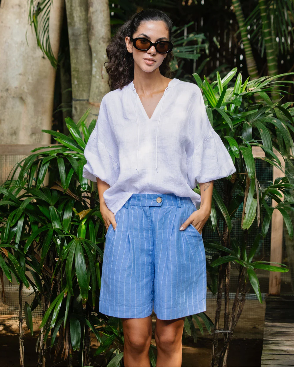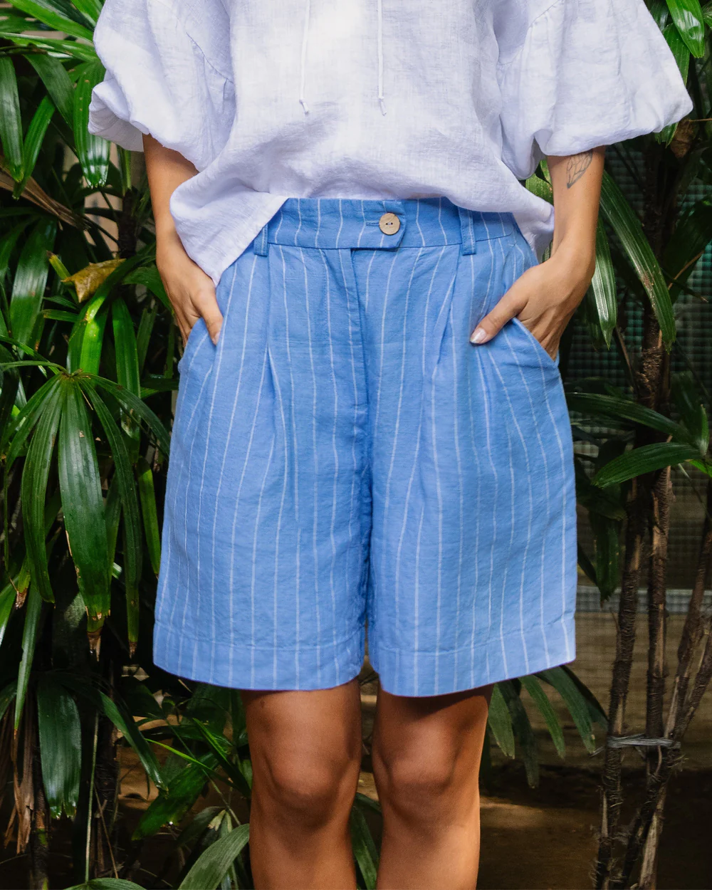 The blue striped linen high – waist shorts are a charming creation that seamlessly combines summery nautical vibes with understated sophisticated style. Their high – waist fit is designed to offer a sense of elegance while still maintaining a comfortable feel. The linen fabric, with its inherent breathability and soft handfeel, not only keeps you cool in scorching temperatures but also adds a touch of natural texture and lightness. The button and zipper closure at the front is a standout feature, providing a secure fit and a polished, put – together aesthetic.Small details enhance their allure: the neatly finished hems, the crisp blue and white stripe pattern, and the way they sit gracefully on the hips all contribute to a refined appearance. The nautical – inspired design is versatile and timeless, pairing effortlessly with a wide range of tops. For a laid – back beach day look, pair them with a white linen tank top, a straw hat, and flip – flops. To elevate the style for a casual lunch date, opt for a light blue linen blouse, a delicate gold necklace, and espadrilles.When it comes to layering, these shorts work well too. Pair them with a lightweight denim jacket or a striped cardigan on cooler summer evenings, and the high – waist design ensures they still fit comfortably and look stylish. No matter how you choose to wear them, these shorts’ comfortable fabric, versatile design, and charming details make them an essential addition to any summer wardrobe, capable of transforming simple outfits into effortlessly stylish ensembles that are perfect for both beach outings and urban adventures.