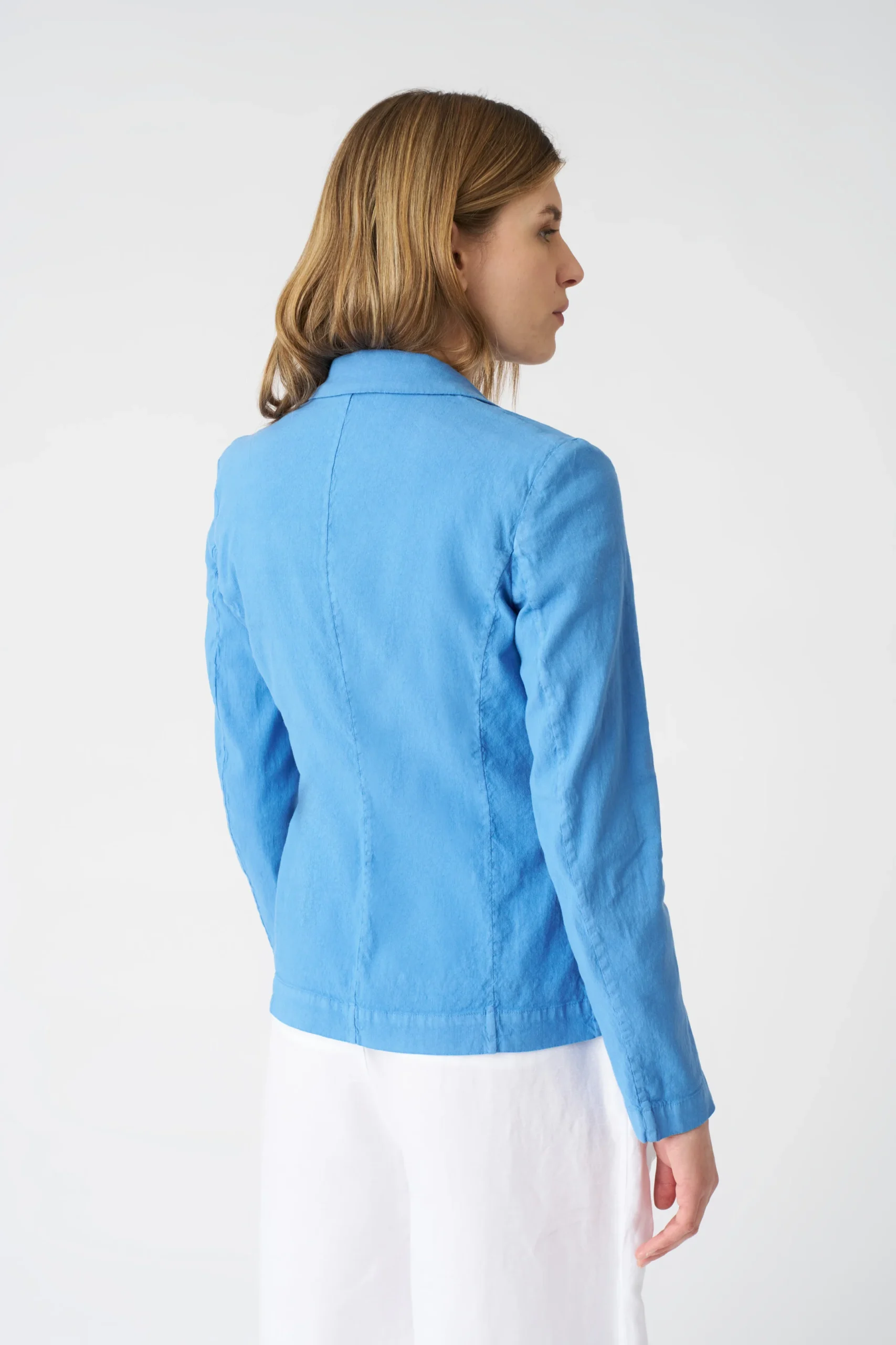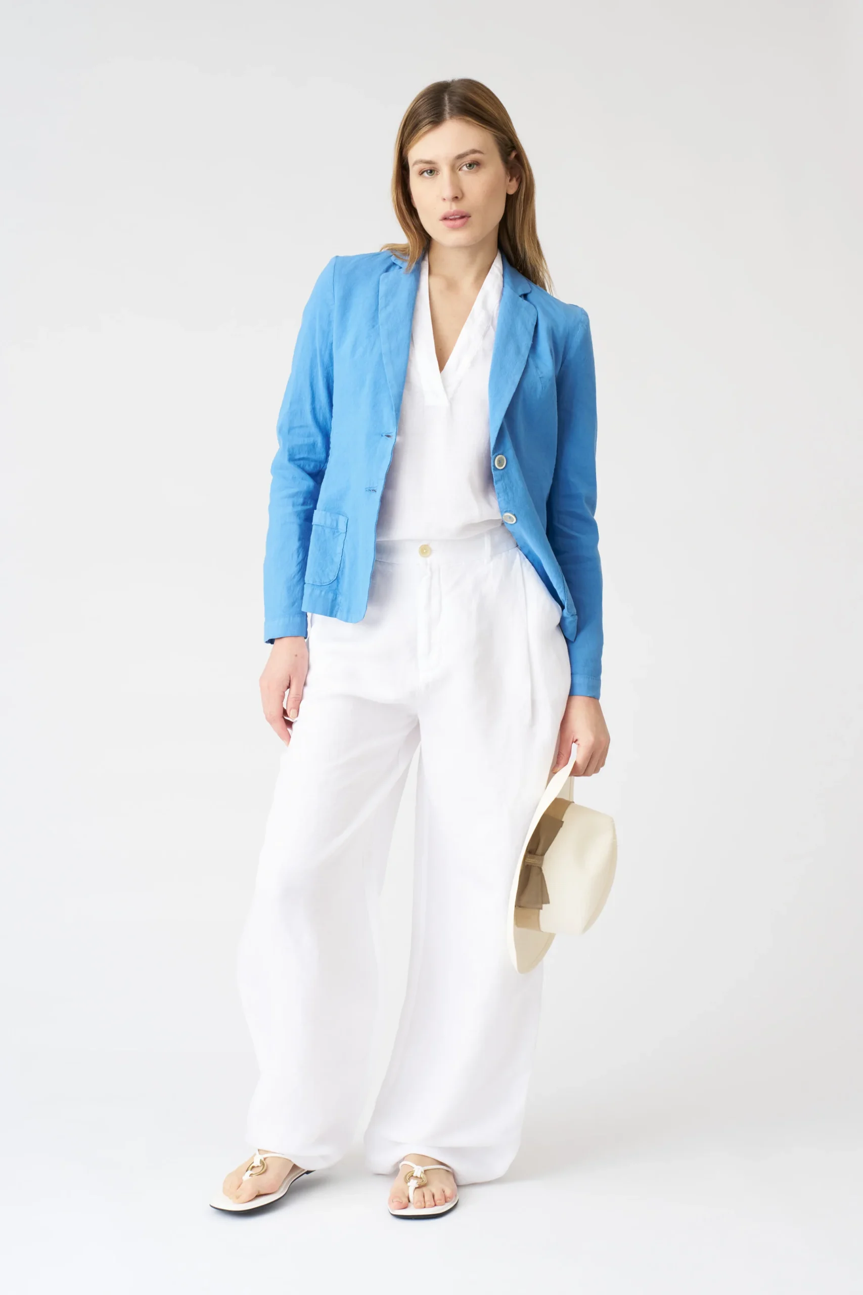 The bright blue linen blazer is a masterclass in combining bold color with timeless design. The silhouette is meticulously tailored — not too tight, allowing for easy layering over shirts or blouses, yet not overly loose, maintaining a sleek profile. The linen fabric, with its natural texture and inherent breathability, not only keeps you cool on sunny days but also adds a touch of organic luxury. The notch lapels are neatly structured, framing the neck elegantly, and the single row of buttons, with their smooth finish, complements the vibrant blue beautifully, enhancing the blazer’s refined charm.Small details elevate its allure: the precise stitching along the seams ensures durability and a polished finish, and the way the linen drapes gives the blazer a gentle, fluid movement. The bright blue shade is incredibly versatile despite its vividness — it pairs harmoniously with neutrals like white, beige, or gray, creating a balanced look, and also stands out brilliantly when matched with other bold hues for a more daring ensemble.When it comes to styling, this blazer opens up a world of possibilities. For a casual daytime outing, layer it over a white tee and high – waisted denim shorts, finishing with white sneakers — the blazer adds a sophisticated touch to the laid – back combo. For a semi – formal office setting, wear it over a crisp white button – down shirt and tailored trousers, pairing with loafers for a polished vibe. On cooler evenings, drape it over a lightweight sweater and a midi skirt, adding ankle boots to complete a cozy yet chic look. No matter how you style it, this blazer’s vibrant color, comfortable fabric, and versatile design make it a standout piece in any wardrobe, capable of transforming even the simplest outfits into something special.