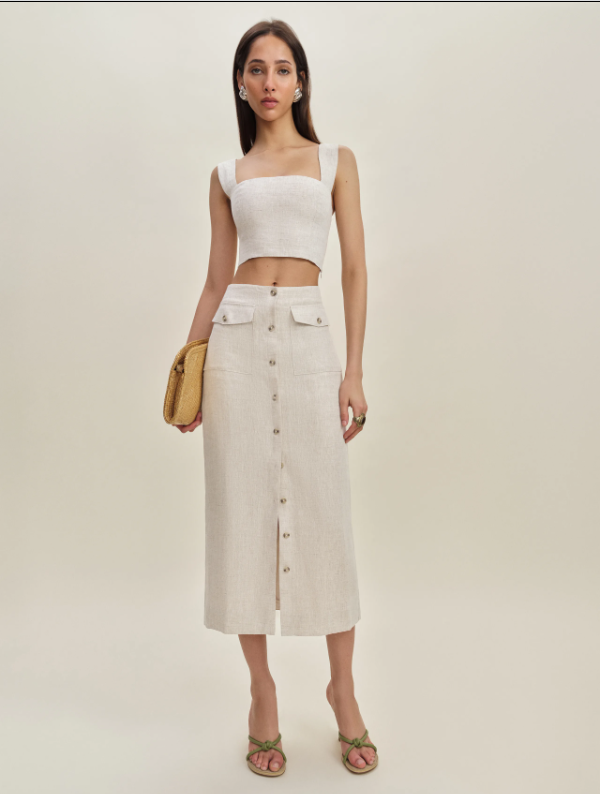 features and Special design:The Linen Elegance Midi Skirt with Button Front is a perfect blend of casual sophistication and breathable comfort. Crafted from linen, it features a stylish button – down front and functional pockets, ideal for effortless chic looks.