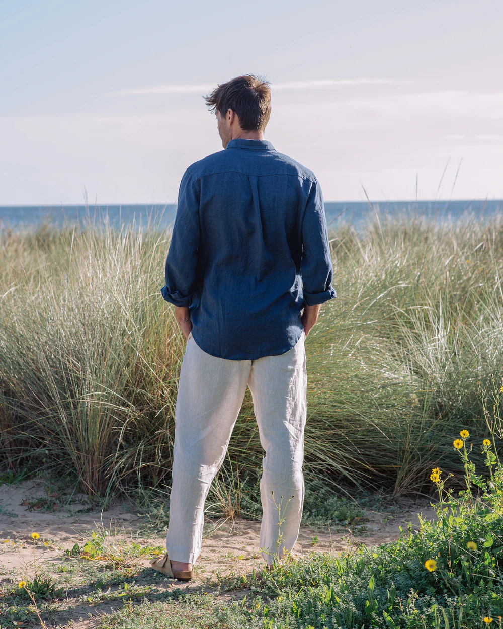 The cream – colored linen trousers are a masterful creation that seamlessly combines casual comfort with understated elegance. Their relaxed fit is designed to offer a sense of ease while still maintaining a flattering shape. The linen fabric, with its inherent breathability and soft handfeel, not only keeps you cool in scorching temperatures but also adds a touch of natural sophistication. The straight – leg design is a standout feature, providing a timeless silhouette that works well with various footwear options.Small details enhance their allure: the neatly finished hems and the subtle texture of the linen fabric catch the light beautifully, adding depth to the cream hue. This versatile color pairs effortlessly with a wide range of tops, from deep blue linen shirts (like the one in the picture) to simple white tees and lightweight sweaters. For a laid – back beach look, pair them with a loose – fitting linen shirt, rolled – up sleeves, and tan sandals. To elevate the style for a casual dinner by the sea, opt for a navy blue polo shirt, a brown leather belt, and boat shoes.When it comes to layering, these trousers work well too. Pair them with a lightweight cardigan or a denim jacket on cooler summer evenings, and the relaxed fit ensures they still look comfortable and stylish. No matter how you choose to wear them, these trousers’ comfortable fabric, versatile design, and charming details make them an essential addition to any summer wardrobe, capable of transforming simple outfits into effortlessly stylish ensembles that are perfect for beach days or casual outings.