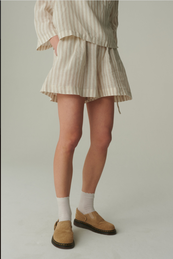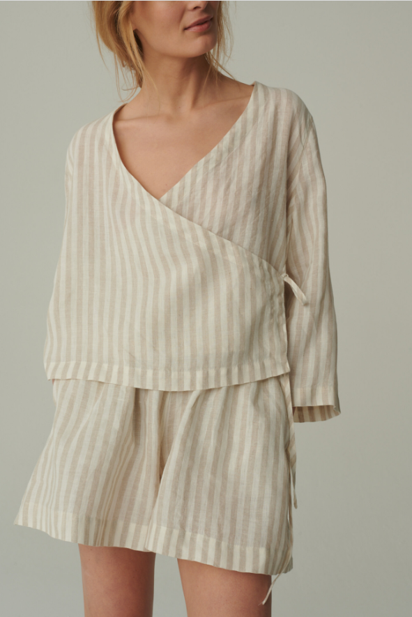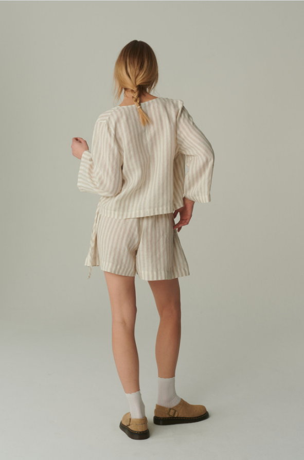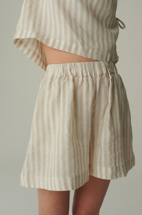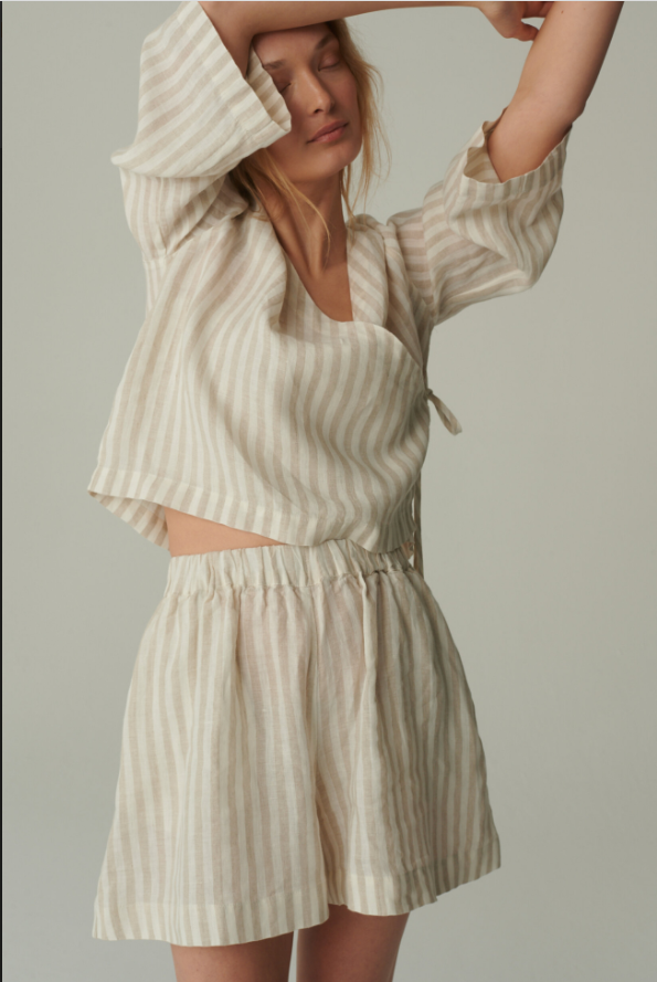 The Kim Linen Shorts are a testament to thoughtful design and timeless elegance. The striped pattern, with its evenly spaced lines, creates a visual harmony that’s both refined and eye – catching. The relaxed fit drapes gracefully over the hips and thighs, offering a flattering silhouette that doesn’t cling, allowing for unrestricted movement.Every detail, from the neatly stitched hems that prevent fraying to the subtle way the fabric falls, showcases the garment’s high – quality craftsmanship. The mid – length cut hits at just the right spot on the leg, elongating the figure while maintaining a sense of modesty. The soft, neutral tones of the stripes make them easy to pair with a variety of tops, from breezy blouses to casual tank tops.Made to complement the matching wrap top, these shorts complete a cohesive look that’s perfect for warm – weather outings. Whether you’re strolling through a garden or enjoying a seaside lunch, the Kim Linen Shorts marry delicate details with relaxed comfort, making them a cherished piece for those who appreciate understated sophistication.