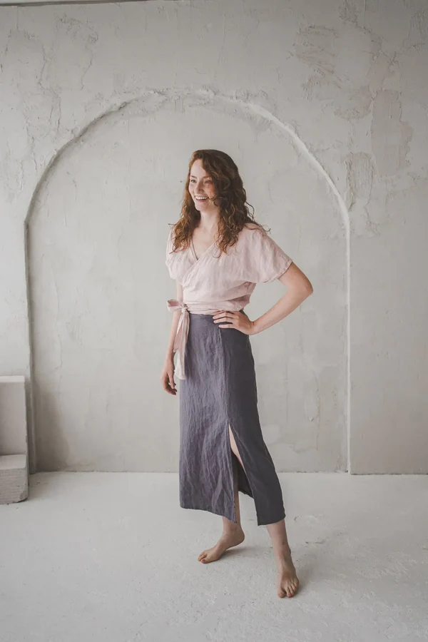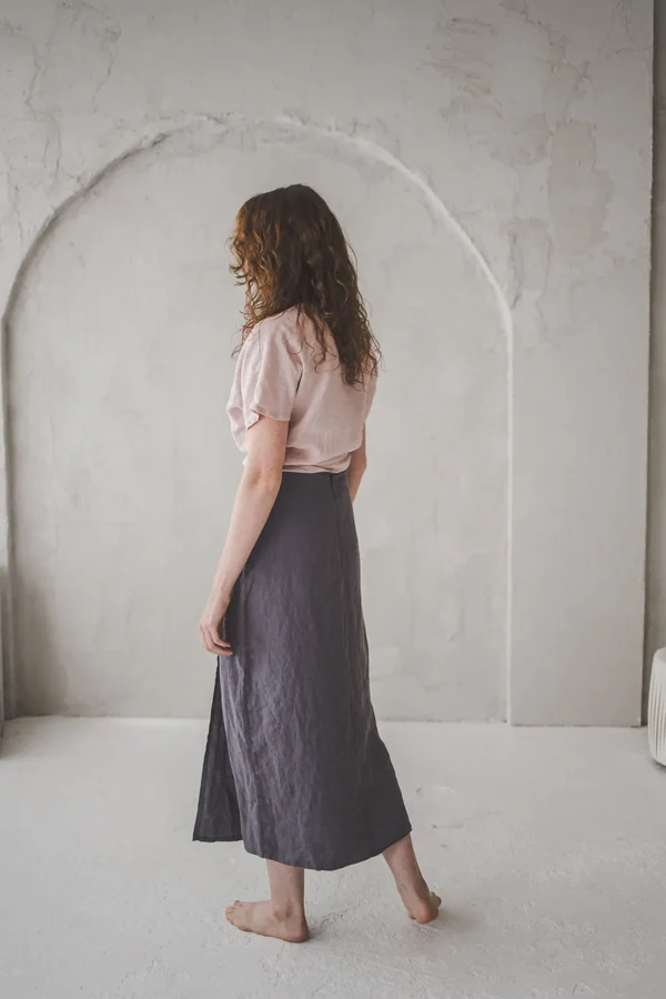 The linen skirt with a front slit from Epic Linen is a testament to thoughtful design and timeless charm. The silhouette is meticulously crafted, with a gentle A – line shape that skims the hips and falls to a sophisticated mid – calf length. The front slit, positioned at just the right height, adds a delicate touch of drama without compromising modesty, allowing for a graceful stride while maintaining an air of refinement.Every small detail contributes to its allure. The muted gray fabric has a lovely texture, with a subtle sheen that catches the light beautifully, enhancing the skirt’s elegant appearance. The stitching is precise, with clean seams that elevate the skirt’s polished look. The waistband sits comfortably, hugging the waist without feeling restrictive, and the overall cut ensures a relaxed yet tailored fit.Whether styled with a flowy blouse for a bohemian – inspired look or paired with a structured blazer for a more polished ensemble, this skirt adapts effortlessly. It embodies a sense of understated luxury, where comfort meets refined style. For those who seek clothing that feels as good as it looks, this linen skirt with a front slit is a true gem, elevating everyday outfits with its subtle yet captivating presence.