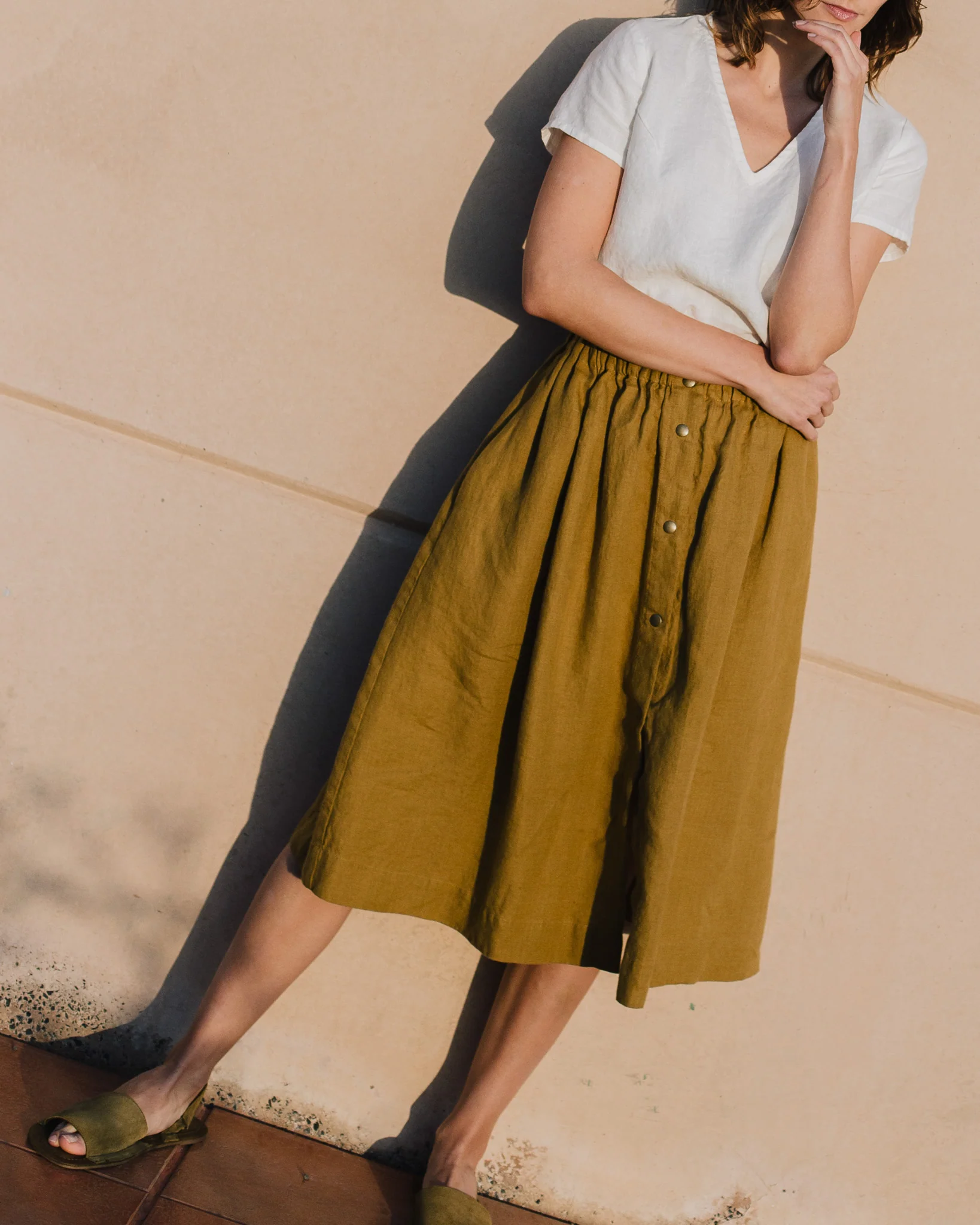 features and Special design:The MARSEILLE linen front snap skirt is a stylish combination of comfort and charm. Its warm, earth – toned color and flowing silhouette, accented by front snaps, add a unique touch to any outfit.