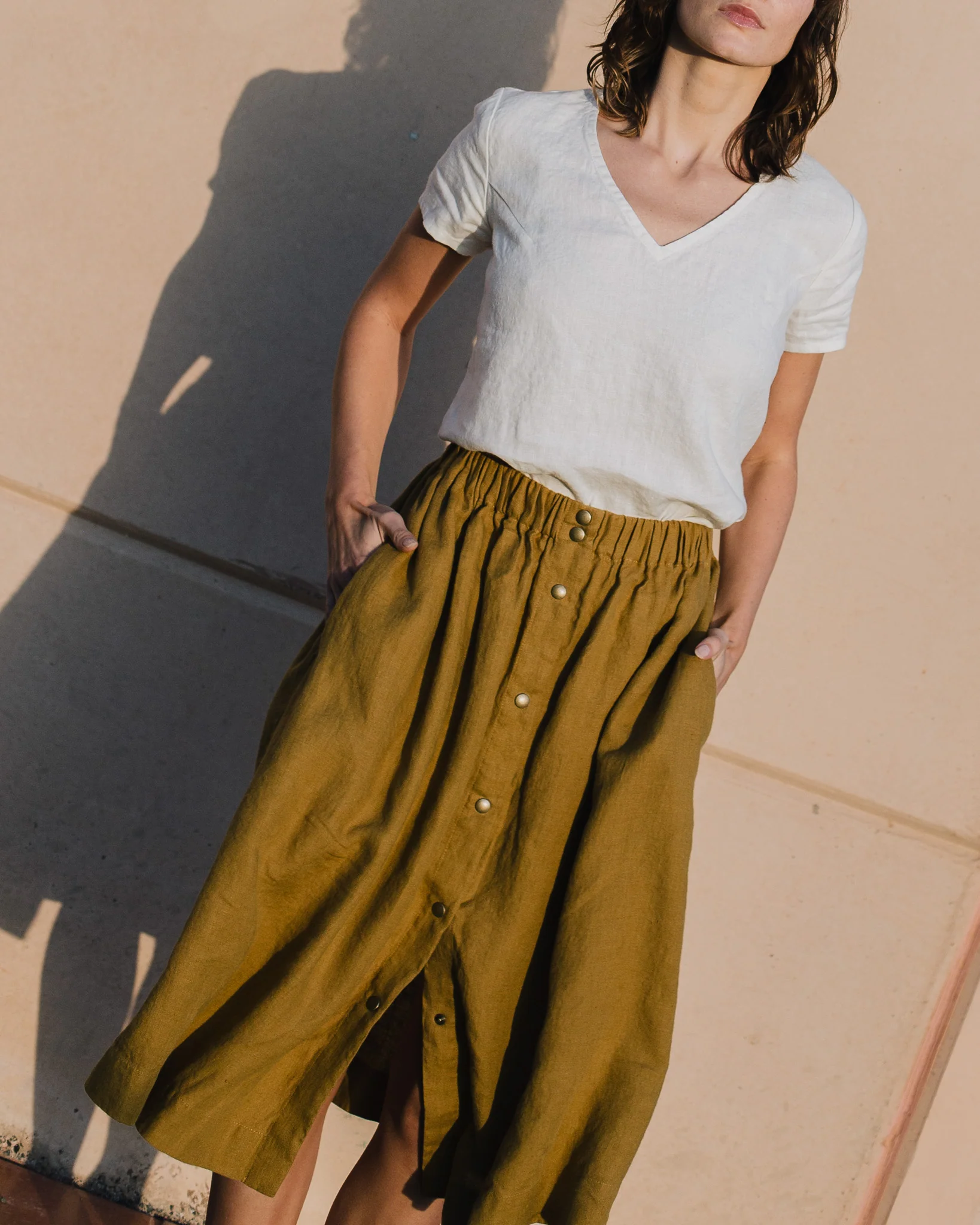 The MARSEILLE linen front snap skirt is a masterpiece of design, blending functionality with timeless style. The silhouette features a gentle A – line shape that gracefully skims the hips and extends to a modest midi – length, creating a flattering look for different body types. The elastic waistband is cleverly integrated, providing a snug and comfortable fit without sacrificing the skirt’s sleek appearance.The front snap details are both practical and aesthetically pleasing. The row of snaps running down the front allows for easy wear and offers styling flexibility, such as partially unsnapping for a more casual look. The warm, earthy fabric has a lovely texture, soft to the touch, and its natural drape gives the skirt an elegant flow as you move. The precise stitching and neatly finished edges highlight the high – quality craftsmanship. Additionally, the side pockets are a thoughtful addition, offering convenience for carrying small essentials.Whether paired with sandals and a breezy top for a laid – back summer look or dressed up with heels and a blazer for a more formal occasion, this skirt adapts seamlessly. It represents a perfect balance between comfort and sophistication, making it an essential piece for those who value both style and practicality in their clothing.