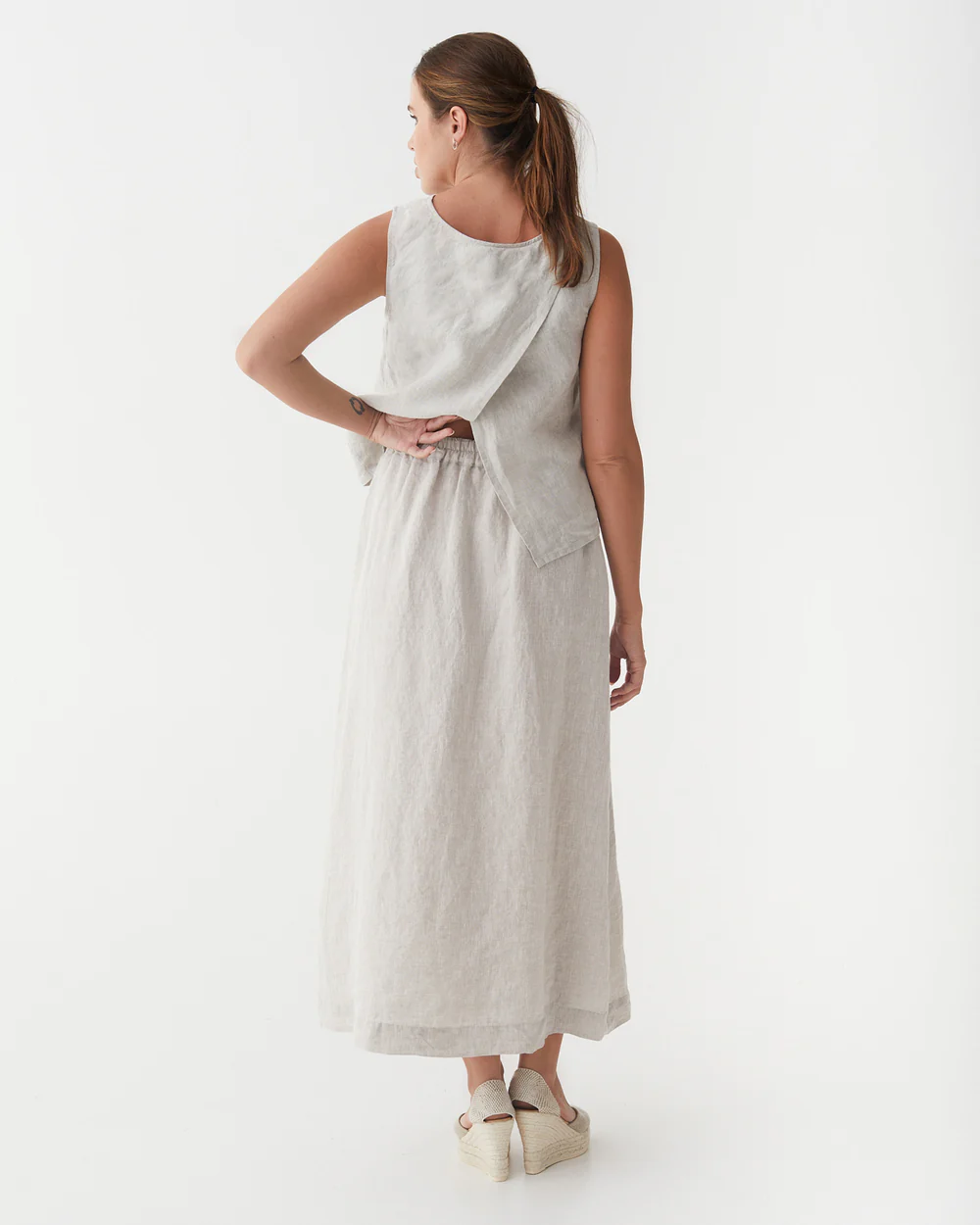 The maxi linen skirt Sentosa in natural melange is a testament to meticulous design and enduring charm. The silhouette is artfully crafted, with a high – waisted cut that cinches the waist and flows into a gracefully flared shape, extending all the way to the ankles. This design not only elongates the figure but also lends an air of effortless sophistication, perfect for both casual and more polished occasions.Every small detail contributes to its allure. The natural melange fabric boasts a lovely, textured appearance, with subtle variations in tone that catch the light beautifully, adding depth and interest to the skirt’s overall look. The stitching is precise, with clean seams that underscore the skirt’s quality construction. The side slit, positioned at just the right height, adds a delicate touch of movement without compromising modesty, allowing the skirt to sway elegantly as you walk. The waistband sits comfortably, hugging the waist without feeling restrictive, and the overall drape of the linen ensures a relaxed yet refined fit.Whether styled with sandals and a breezy blouse for a laid – back summer vibe or paired with heels and a tailored blazer for a more formal event, this skirt adapts effortlessly. It embodies a sense of quiet luxury, where comfort meets refined style. For those who seek clothing that feels as enchanting as it looks, this maxi linen skirt is a true gem, elevating everyday outfits with its subtle yet captivating presence.