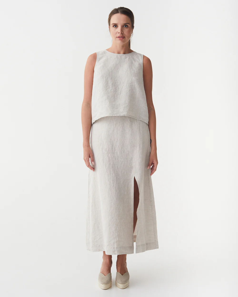 features and Special design:The maxi linen skirt Sentosa in natural melange is a stunning blend of understated luxury and effortless grace. Its flowing silhouette and subtle side slit bring a touch of refined allure to any ensemble.