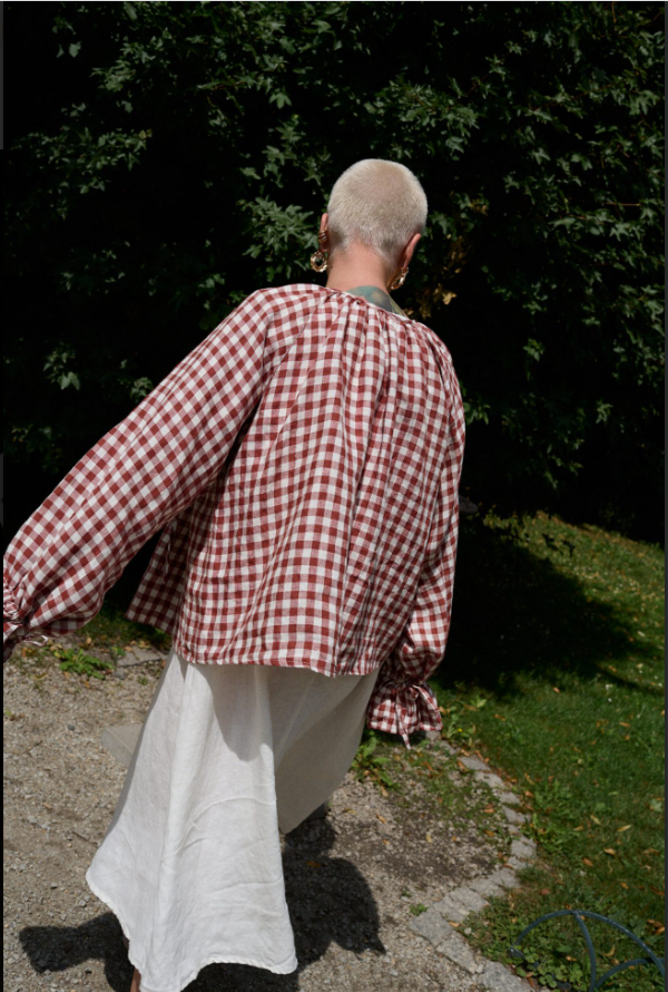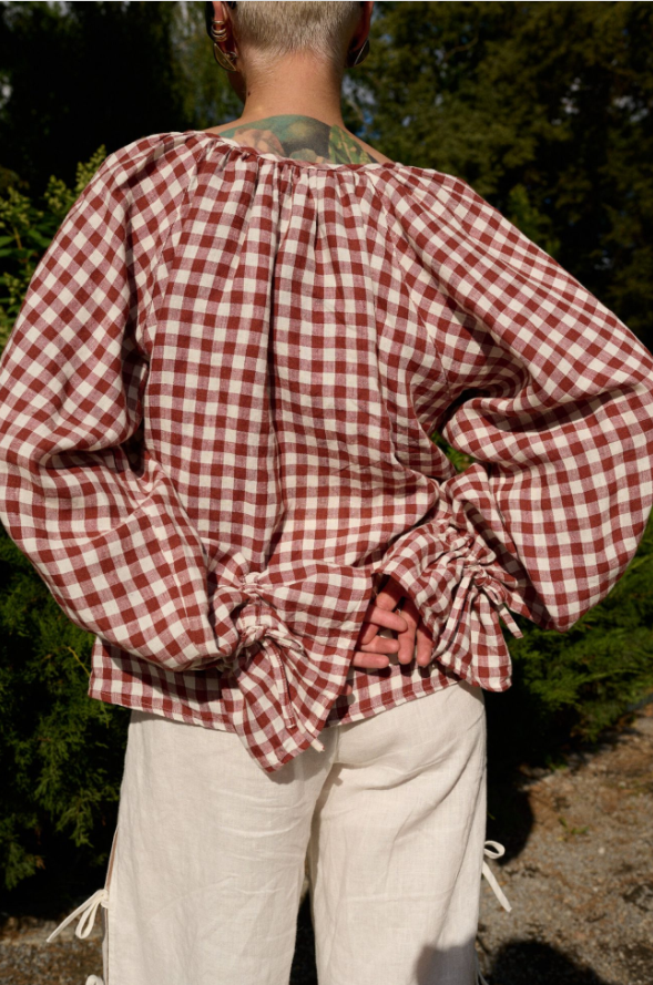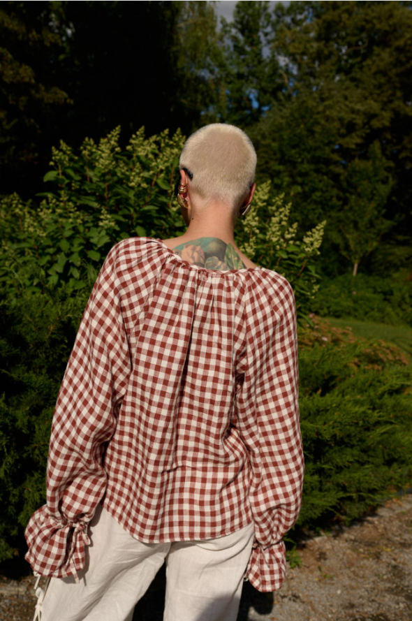 The Mila Linen Top 1 is a testament to the beauty of thoughtful detailing and vintage – inspired design. The checkered pattern, in warm reddish – brown and soft white, creates a visual harmony that’s both classic and inviting. The off – the – shoulder neckline is crafted to sit gracefully, framing the collarbone and shoulders in a way that feels effortlessly alluring without being overly revealing.The long sleeves are a highlight, with their ruffled cuffs adding a delicate, romantic touch. Each ruffle is meticulously formed, lending texture and a sense of whimsy to the overall silhouette. The top’s loose, flowy fit drapes beautifully over the body, ensuring comfort while maintaining a polished appearance. This silhouette flatters various body types, skimming over the figure without clinging, allowing for ease of movement.Subtle elements, like the gentle gathering at the neckline and the smooth hemline, speak to the garment’s quality craftsmanship. Whether paired with wide – legged linen pants for a cohesive, bohemian look or tucked into a high – waisted skirt for a more structured ensemble, the Mila Linen Top 1 marries vintage aesthetics with modern comfort, making it a cherished piece for those who appreciate understated sophistication.
