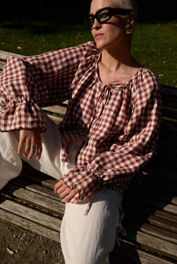 features and Special design:The Mila Linen Top 1 is a delightful fusion of vintage charm and modern ease. With its checkered pattern and ruffled cuffs, it brings a playful yet refined touch to any look.