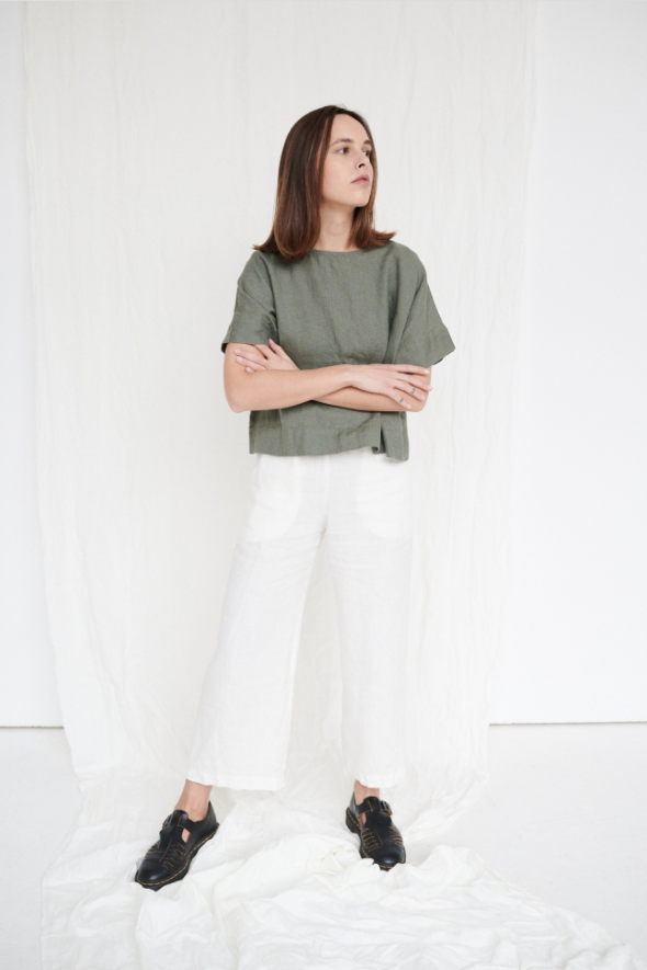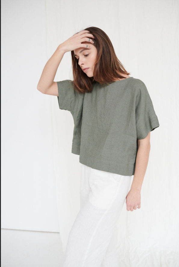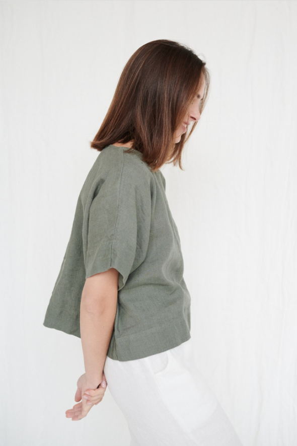 、The Mona Linen Top is a testament to thoughtful design and timeless appeal. The loose, boxy fit drapes gracefully over the body, creating a relaxed yet polished look. This silhouette flatters various body types, offering both comfort and a touch of laid – back chic.The boat – neckline is a standout feature, framing the collarbone beautifully and adding an air of elegance. It strikes a perfect balance between casual and refined, making the top suitable for multiple occasions. The short sleeves are cut in a way that allows for ease of movement, with a slight width that gives them a gentle, flowing appearance.Every detail, from the clean seams to the subtle texture of the linen, contributes to its overall charm. The muted green color is both versatile and soothing, evoking images of nature. Whether you tuck it into high – waisted pants for a more defined look or wear it loose over skirts, the Mona Linen Top seamlessly blends into your style, bringing a sense of effortless beauty to your everyday wear.