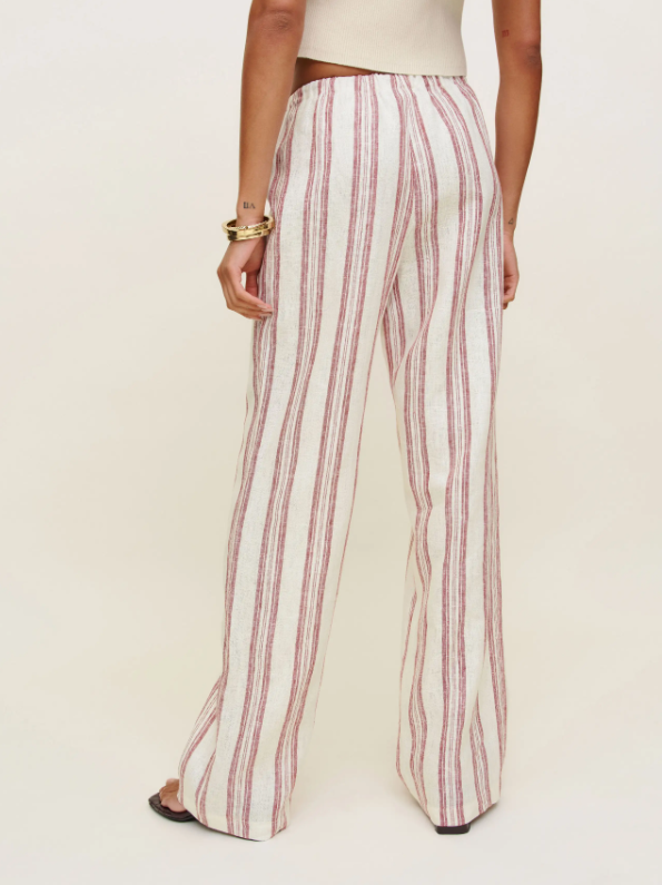 The Olina Linen Pant is a testament to thoughtful design and timeless appeal. The striped pattern, in gentle hues, creates a visual harmony that’s both classic and inviting. The wide – leg cut is crafted to perfection, draping gracefully over the legs and elongating the silhouette, making one look taller and slimmer.The drawstring waist is not only functional but also adds a touch of casual charm. It can be adjusted to your liking, offering a snug or relaxed fit as desired. This detail not only ensures comfort but also allows for easy styling, whether you want to tuck in a top for a polished look or leave it untucked for a laid – back vibe.Subtle elements, like the clean seams and the smooth hemline, speak to the garment’s quality craftsmanship. The linen fabric lends a breathable and lightweight feel, perfect for warm days, while the striped pattern adds a playful yet sophisticated touch. Whether paired with a fitted tank top for a chic summer look or with a button – down shirt for a more refined outfit, the Olina Linen Pant marries classic aesthetics with modern comfort, making it a cherished piece for those who appreciate understated sophistication.