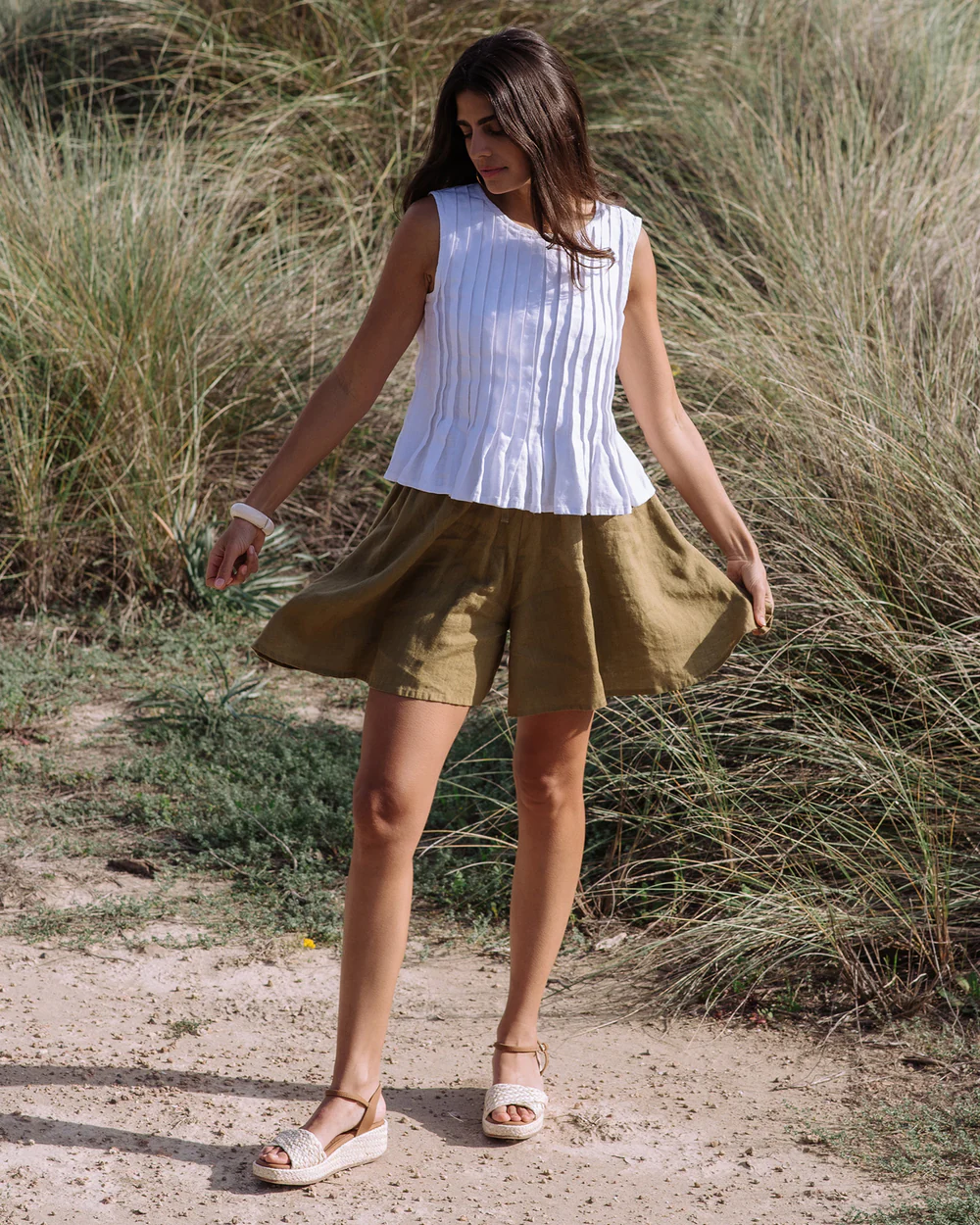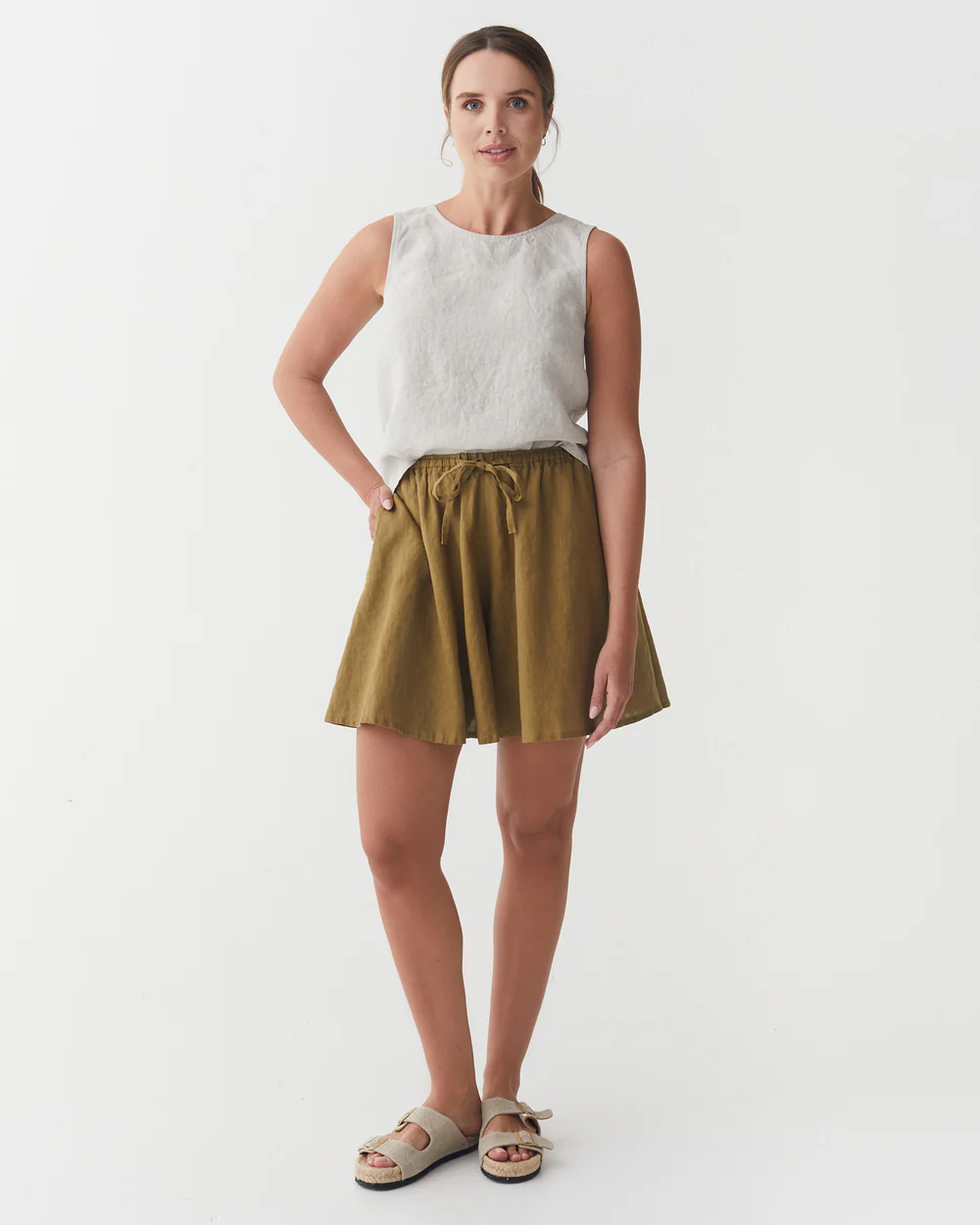 The olive green linen drawstring shorts are a charming creation that seamlessly combines casual comfort with understated appeal. Their relaxed fit is designed to offer a sense of ease while still maintaining a flattering shape. The linen fabric, with its inherent breathability and soft handfeel, not only keeps you cool in mild temperatures but also adds a touch of natural texture and warmth. The drawstring waistband is a standout feature, providing adjustability for a perfect fit and a casual, laid – back aesthetic.Small details enhance their allure: the neatly finished hems, the subtle texture of the linen fabric, and the practical side pockets all contribute to a polished and functional appearance. The olive green hue is versatile and timeless, pairing effortlessly with a wide range of tops. For a laid – back weekend look, pair them with a simple white linen tee, a denim jacket, and sandals. To elevate the style for a casual coffee date, opt for a light blue linen blouse, a thin leather belt, and espadrilles.When it comes to layering, these shorts work well too. Pair them with a lightweight cardigan or a denim vest on cooler days, and the drawstring waist ensures they still fit comfortably. No matter how you choose to wear them, these shorts’ comfortable fabric, versatile design, and charming details make them an essential addition to any casual wardrobe, capable of transforming simple outfits into effortlessly stylish ensembles that are perfect for both everyday wear and casual outings.