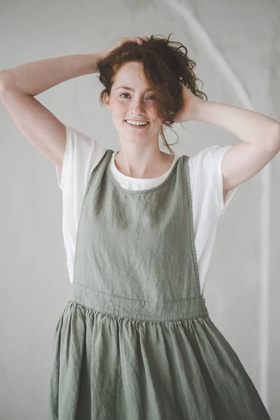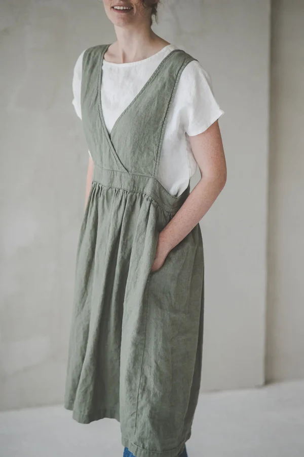 The olive – green overall dress is a masterpiece of understated design, where every detail contributes to its timeless appeal. The deep V – neckline is a standout feature, gracefully framing the upper body and creating a sense of elongation for the neck. The straps are wide and sturdy, providing both support and a touch of vintage charm.At the waist, the gathered detailing is exquisite — it cinches the waist subtly, enhancing the figure without being too tight, and then flows into a full, airy skirt. This gathering not only adds texture and movement but also ensures the dress drapes beautifully, swaying gently with each step. The side pockets are a practical and stylish addition, perfect for keeping small essentials or just resting hands casually. The midi length is both elegant and practical, hitting at a flattering point on the leg. The soft olive color is versatile, complementing various skin tones and easy to pair with different tops and footwear. Every aspect, from the smooth seams to the precise cut of the skirt, reflects careful craftsmanship, making this dress a beloved piece for those who appreciate quiet sophistication in their wardrobe.
