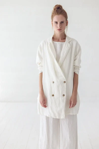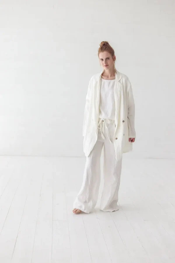 The oversized linen double – breasted blazer is a masterstroke in combining casual comfort with timeless sophistication. The silhouette is intentionally oversized, designed to cocoon the body in a soft embrace while allowing for easy layering over various outfits. The linen fabric, with its natural texture and breathability, not only keeps you cool but also adds a touch of organic luxury to the piece. The double – breasted front, adorned with sleek metallic buttons, is a classic detail that elevates the blazer’s elegance, while the notched lapels add a tailored touch without feeling stuffy. The long sleeves, with their clean finish, can be worn down for a more polished look or rolled up to create a relaxed, effortless vibe.Small details enhance its charm: the fine stitching along the seams ensures durability and a refined finish, and the way the linen drapes gives the blazer a gentle, flowing movement. Available in versatile hues like crisp white and vibrant red, each color brings its own personality — white exudes purity and versatility, while red adds a bold, confident flair. These colors pair beautifully with neutrals like beige, gray, or navy, as well as with each other for a monochromatic or contrasting statement.When it comes to styling, this blazer offers endless possibilities. For a casual daytime look, pair the white version with a simple tee and denim jeans, finishing with sneakers — the oversized blazer balances the casualness of the jeans for an effortlessly chic ensemble. To create a more elevated outfit for an evening event, opt for the red blazer, wearing it over a silk camisole and tailored trousers, and add heels to lend a touch of glamour. It also works wonderfully as a layering piece for cooler days — drape it over a lightweight sweater with a midi skirt for a cozy yet refined look. No matter how you choose to style it, this blazer’s combination of relaxed fit, luxurious fabric, and versatile design makes it a standout addition to any wardrobe.