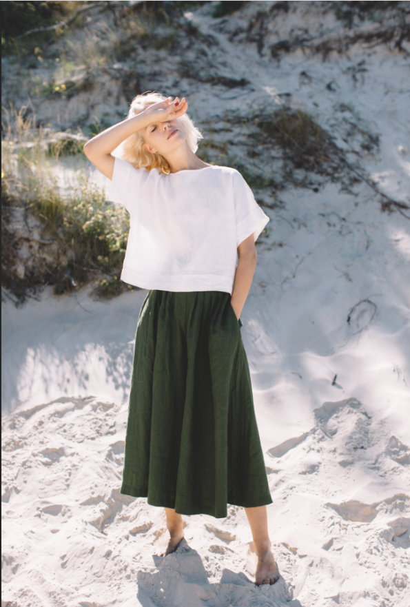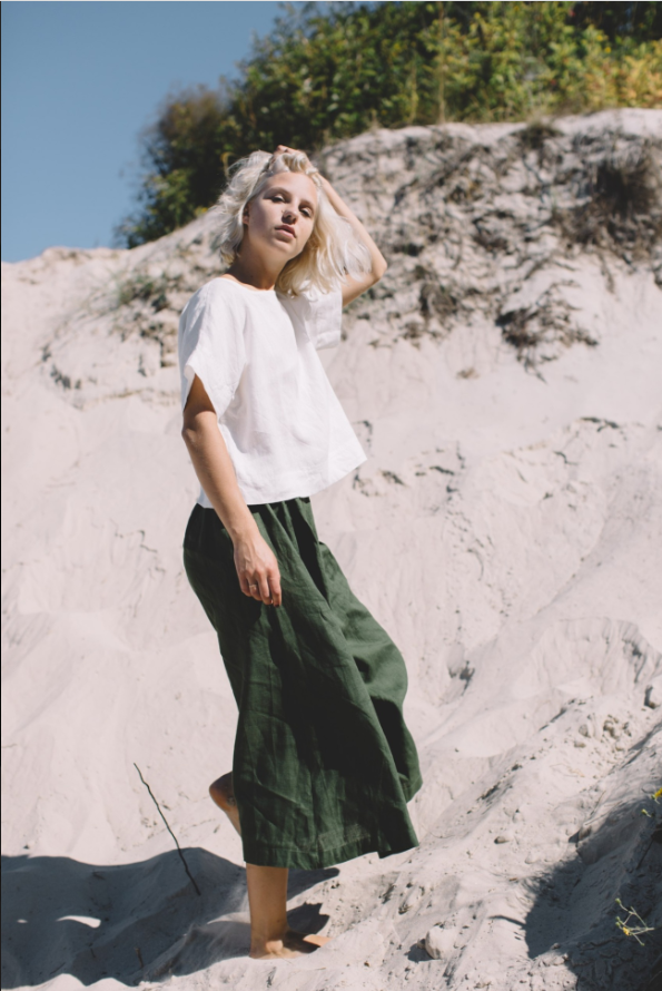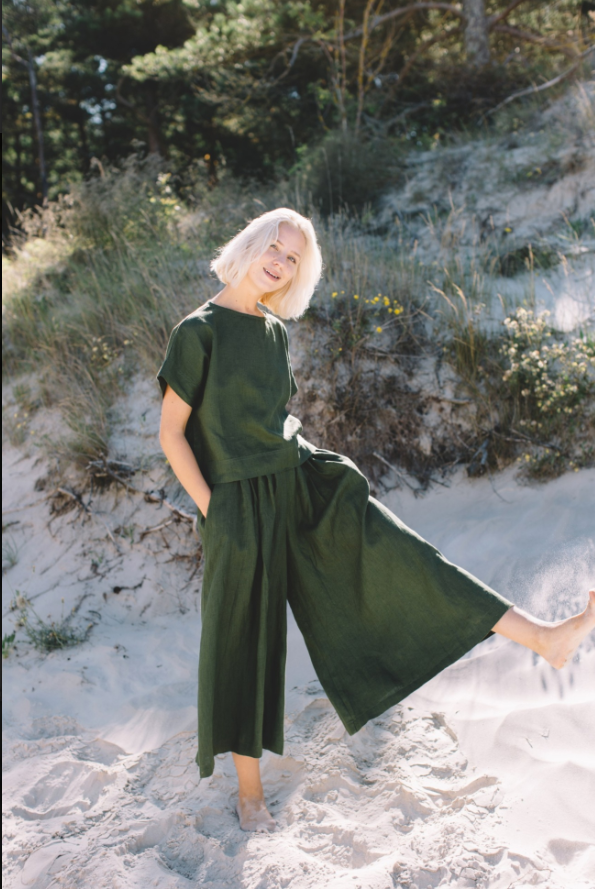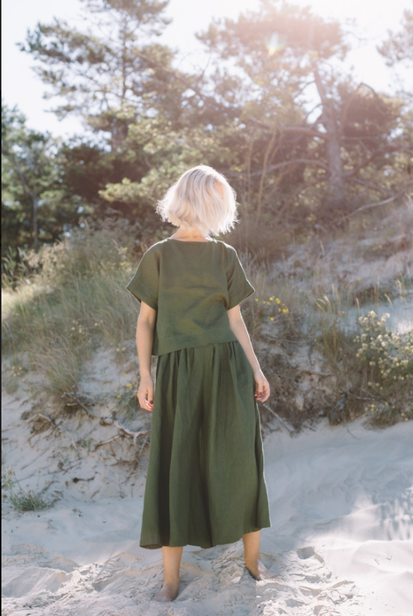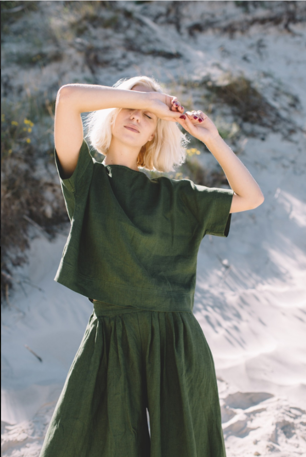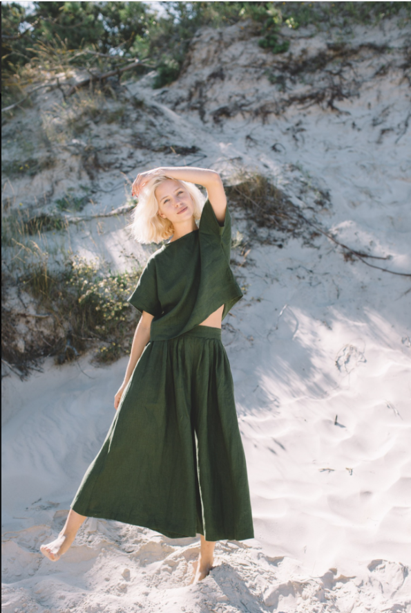 The Palazzo Pants Clementine are a masterpiece of design, seamlessly merging style and comfort. The wide – leg structure is expertly tailored, starting from a well – fitted waistband that ensures a snug yet comfortable fit. It then gracefully expands into a voluminous leg that skims the ground, creating a dramatic and flattering silhouette that elongates the legs and gives the wearer a statuesque presence.The deep green fabric is of exceptional quality, boasting a luxurious feel and a beautiful drape that moves fluidly with every step. The stitching is meticulous, with clean hems and seams that not only enhance the pants’ durability but also contribute to their polished look. The color itself is a statement, rich and earthy, evoking a sense of nature and sophistication.These pants offer endless styling possibilities. Paired with the cropped top in the photo, they create a cohesive and trendy ensemble perfect for a beachside outing. Or, when matched with a silk blouse and heels, they transform into an elegant outfit suitable for a more formal event. The Palazzo Pants Clementine, with their attention to detail and flattering fit, are a true testament to timeless fashion, making them a prized possession for fashion enthusiasts.