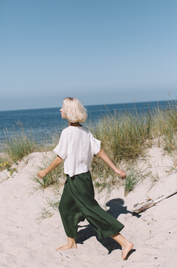 The Palazzo Pants Clementine are a fashion staple that combines comfort with high style. The generously wide – leg silhouette offers a sense of freedom and movement, making them ideal for long days on the go. The deep green shade is both versatile and striking, easily paired with a variety of tops, whether it’s the cropped green top in the image or a simple white tee. The pants’ waist is designed to sit comfortably, and the fabric has a beautiful drape that flatters the figure. Whether you’re strolling on the beach as shown, or attending a summer soiree, these pants blend relaxed elegance with a bold fashion statement, becoming a must – have in your warm – weather collection.
