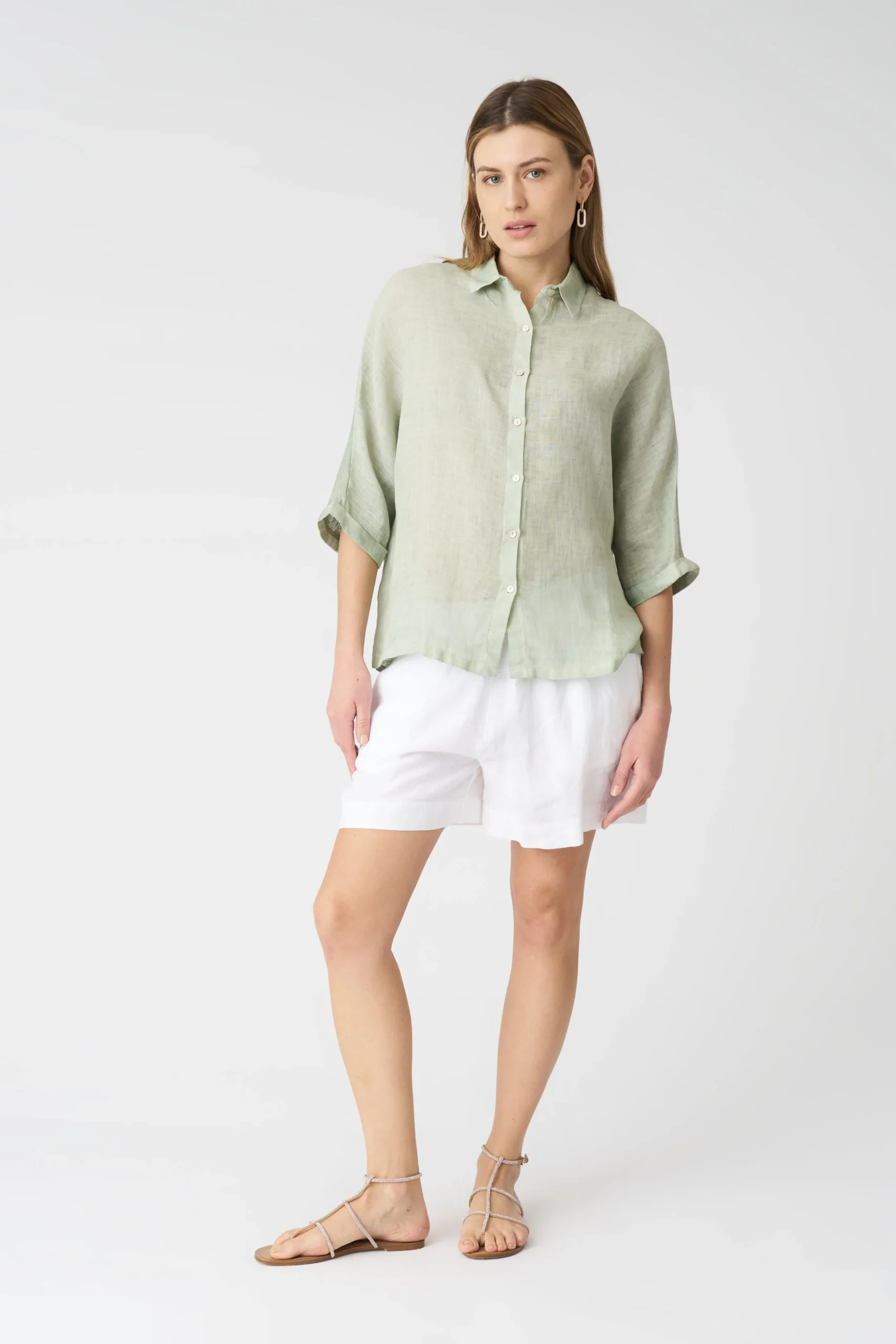 The sage green batwing – sleeve shirt is a masterclass in combining classic design with modern comfort. The oversized 版型( silhouette ) is the core of its appeal, allowing the fabric to flow freely and create a laid – back, effortless look. The batwing sleeves are the standout feature, with their unique shape adding a touch of drama and movement to the shirt. They start wide at the shoulders and gradually narrow towards the cuffs, which are finished with a subtle roll for a polished touch.Small details elevate the shirt’s charm: the crisp pointed collar frames the neck beautifully, the smooth button placket runs down the front for easy wear and a neat appearance, and the lightweight fabric ensures breathability and comfort throughout the day. The sage green hue is soft and versatile, complementing a range of skin tones and pairing well with various colors.When it comes to styling, this shirt offers endless possibilities. For a professional ensemble, pair it with tailored trousers and loafers, leaving it untucked for a relaxed yet polished office look. For a weekend brunch, tuck it into high – waisted jeans and add sneakers for a casual, chic vibe. In warmer weather, it can be worn over a bikini as a cover – up at the beach, or paired with shorts for a cool, laid – back summer outfit. You can also layer it under a blazer for a more structured feel or wear it over a tank top for a breezy, layered look. Each styling choice highlights different aspects of the shirt — from its dramatic sleeves to its versatile color — making it a true wardrobe staple that adapts seamlessly to any occasion.