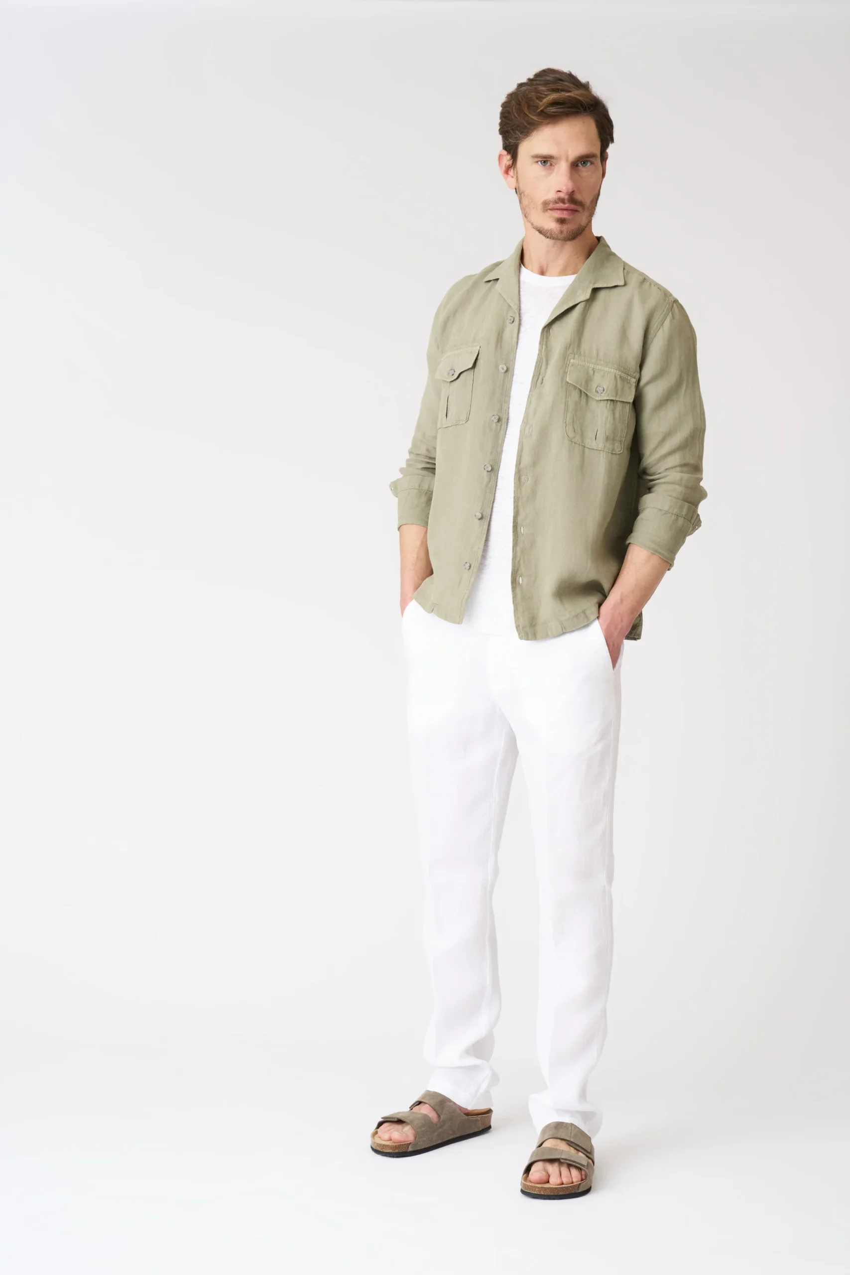 The sage green linen utility shirt jacket is a masterful piece that seamlessly merges workwear inspiration with contemporary elegance. Its silhouette is deliberately relaxed, offering a sense of ease without appearing shapeless. The linen fabric, with its natural texture and inherent breathability, not only keeps you comfortable in mild temperatures but also adds a touch of organic luxury. The shirt collar sits neatly around the neck, creating a sleek and approachable line, while the full button – down front allows for versatile styling — wear it fully fastened for a polished look or leave it open over a tee for a more casual feel.Small details enhance its allure: the precise stitching along the seams ensures durability and a refined finish, and the two chest pockets are both functional and stylish accents, reminiscent of classic utility wear. The soft sage green hue is incredibly versatile, evoking a sense of nature and tranquility, and it pairs effortlessly with a wide range of bottoms, from light – wash denim jeans and chinos to neutral – toned trousers or even linen shorts for a relaxed summer ensemble.When it comes to styling, this jacket opens up numerous possibilities. For a casual daytime look, pair it with a white crew – neck tee, light denim jeans, and white sneakers — the sage green jacket adds a pop of color and a touch of rugged charm to the relaxed outfit. For a smart – casual office setting, tuck a linen shirt into tailored chinos and finish with leather loafers for a polished yet approachable vibe. On cooler days, layer it over a lightweight sweater and under a denim jacket, adding a scarf for extra warmth and style. No matter how you choose to wear it, this jacket’s comfortable fabric, versatile design, and charming details make it a must – have in any wardrobe, capable of elevating even the simplest outfits to new heights of style.