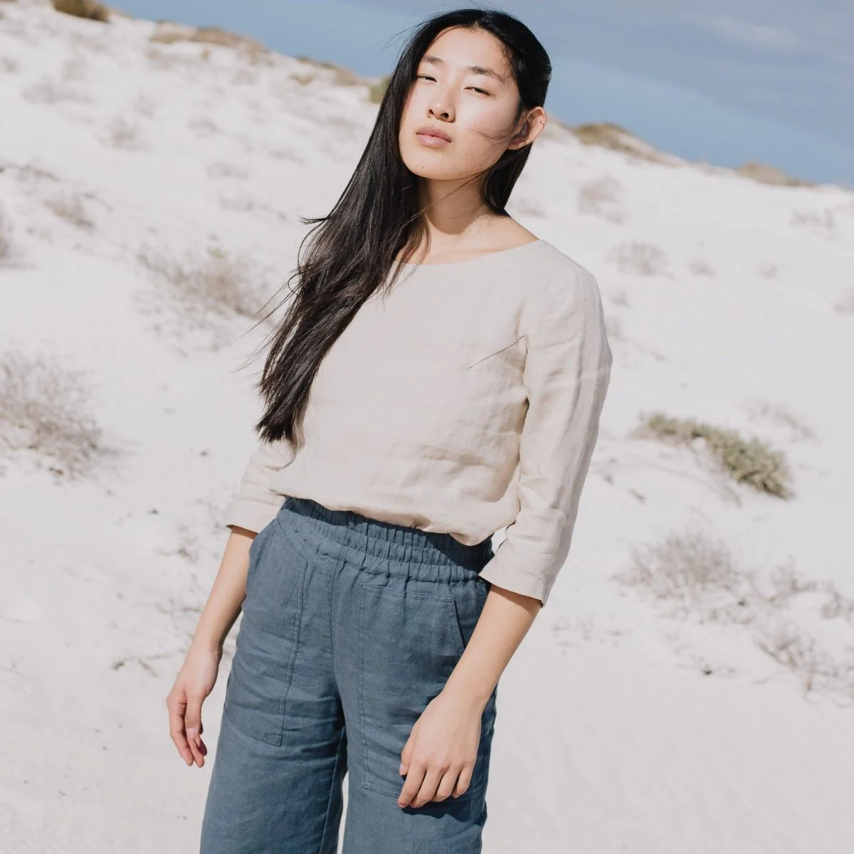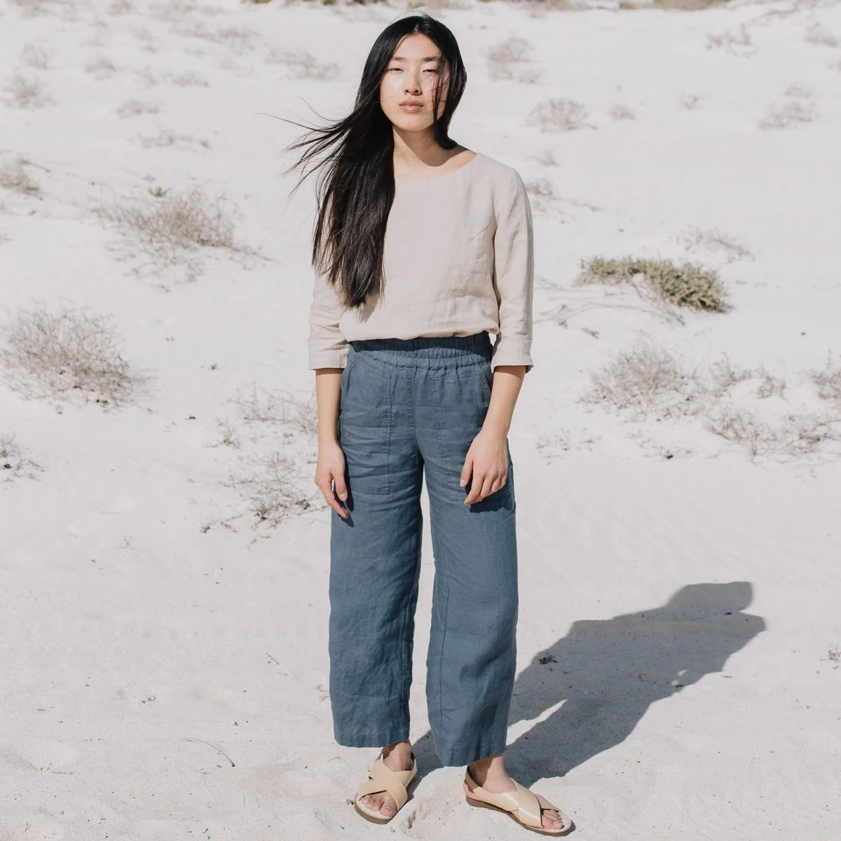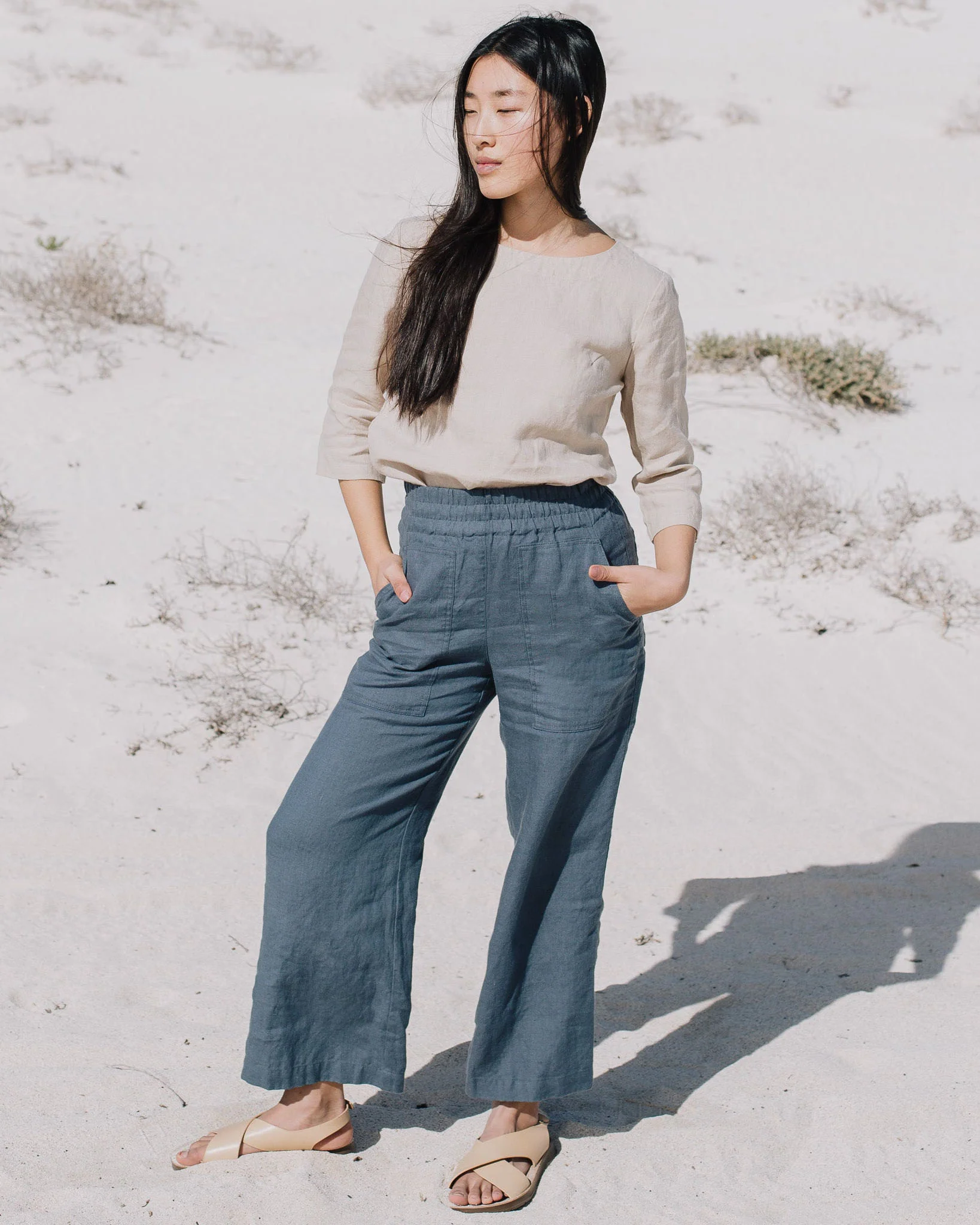 The slate blue linen elastic – waist wide – leg trousers are a charming creation that seamlessly combines casual comfort with understated sophistication. Their wide – leg fit is designed to offer a sense of ease and flow, making them perfect for all – day wear. The linen fabric, with its inherent breathability and soft handfeel, not only keeps you cool in mild temperatures but also adds a touch of natural texture and elegance. The elasticated waistband is a standout feature, providing adjustability for a perfect fit and a casual, laid – back aesthetic.Small details enhance their allure: the neatly finished hems, the subtle texture of the linen fabric, and the way they drape all contribute to a refined appearance. The slate blue hue is versatile and calming, pairing effortlessly with a wide range of tops. For a laid – back weekend look, pair them with a simple beige linen top (like the one in the picture), a denim jacket, and sandals. To elevate the style for a casual brunch, opt for a white linen shirt, a woven belt, and espadrilles.When it comes to layering, these trousers work well too. On cooler days, pair them with a lightweight knit cardigan or a denim vest, and the elastic waist ensures they still fit comfortably. No matter how you choose to wear them, these trousers’ comfortable fabric, versatile design, and charming details make them an essential addition to any casual wardrobe, capable of transforming simple outfits into effortlessly stylish ensembles that are perfect for both everyday wear and casual outings, especially in serene outdoor settings like the beach or a park.