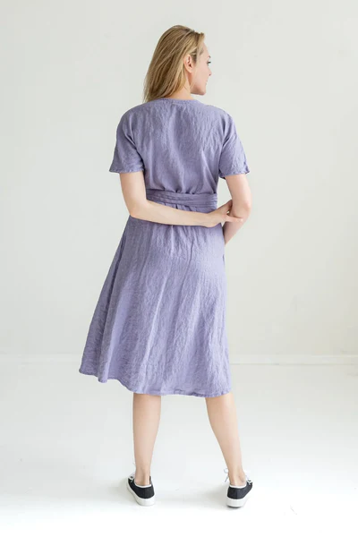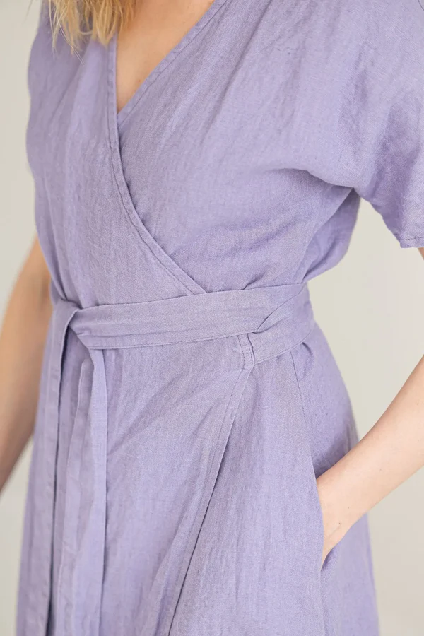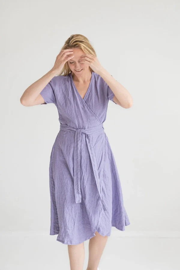 The soft linen wrap dress from Epic Linen is a masterpiece of design, where every detail contributes to its timeless allure. The wrap construction is the highlight, creating a deep V – neckline that elegantly frames the collarbone and adds a hint of allure. This design also allows the dress to drape fluidly over the torso, skimming curves in a way that’s both flattering and comfortable.At the waist, the wide self – tie belt is not only a stylish accent but also a functional element, enabling you to cinch the dress to your desired fit — whether you prefer a snug waist or a more relaxed silhouette. The short sleeves are tailored to hit at a flattering point on the arm, balancing coverage and a breezy feel. The midi – length skirt flows into a gentle A – line, moving gracefully with each step. The delicate texture of the linen fabric enhances the dress’s softness, and the precise stitching along the wrap edges ensures durability while maintaining a refined look. Every aspect, from the calming lavender color that suits all seasons to the thoughtful placement of the belt, makes this dress a versatile and elegant choice for any occasion, be it a daytime gathering or a special night out.