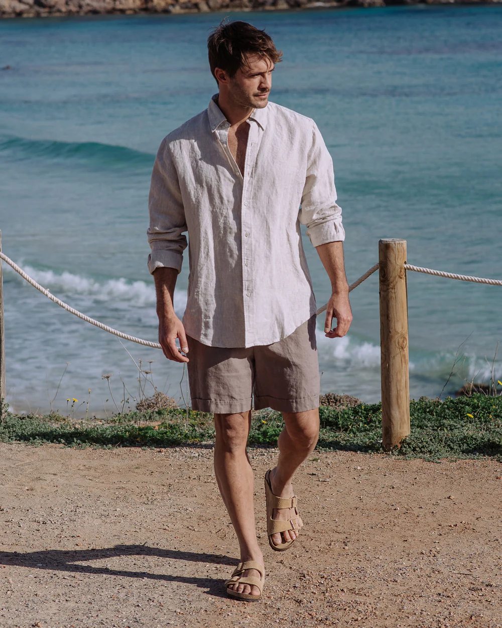 The taupe linen shorts are a masterful creation that seamlessly combines casual comfort with understated elegance. Their relaxed fit is designed to offer a sense of ease while still maintaining a flattering shape. The linen fabric, with its inherent breathability and soft handfeel, not only keeps you cool in scorching temperatures but also adds a touch of natural sophistication. The mid – length cut is a standout feature, hitting just above the knee to show a bit of leg while still keeping things modest.Small details enhance their allure: the neatly finished hems and the subtle texture of the linen fabric catch the light beautifully, adding depth to the taupe hue. This versatile color pairs effortlessly with a wide range of tops, from crisp white linen shirts to simple t – shirts and lightweight sweaters. For a laid – back beach look, pair them with a loose – fitting linen shirt, like the one in the picture, and beige sandals. To elevate the style for a casual dinner by the sea, opt for a navy blue polo shirt, a brown leather belt, and espadrilles.When it comes to layering, these shorts work well too. Pair them with a lightweight cardigan or a denim jacket on cooler summer evenings, and the relaxed fit ensures they still look comfortable and stylish. No matter how you choose to wear them, these shorts’ comfortable fabric, versatile design, and charming details make them an essential addition to any summer wardrobe, capable of transforming simple outfits into effortlessly stylish ensembles that are perfect for beach days or casual outings.