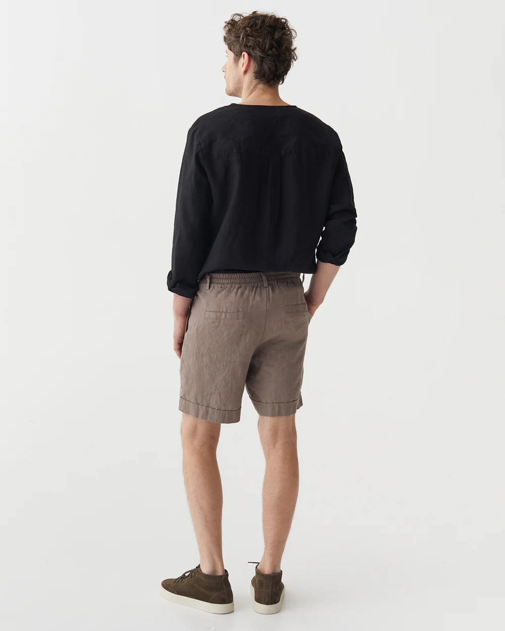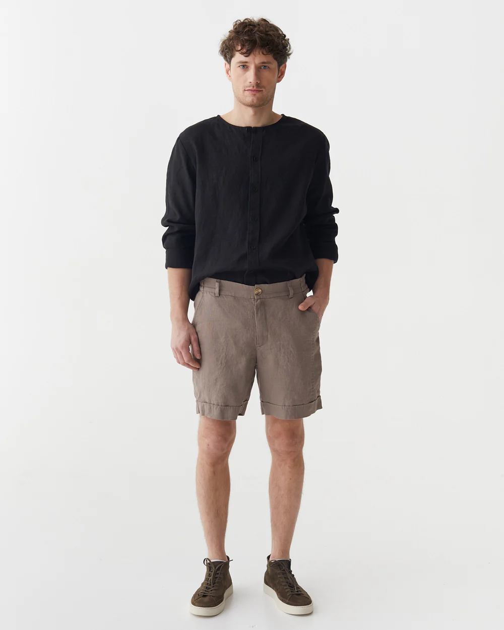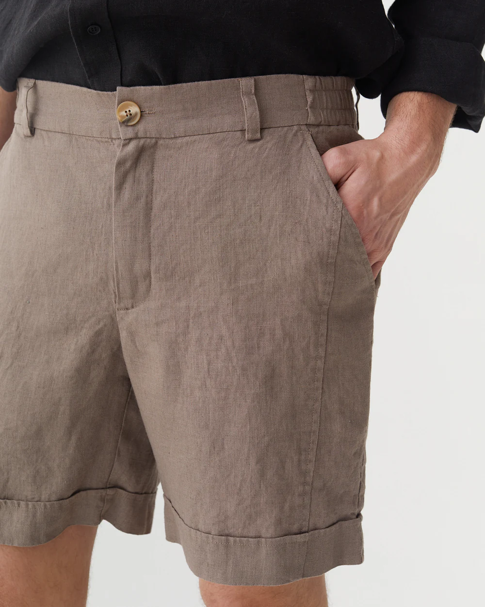The taupe linen shorts are a masterful creation that seamlessly combines casual comfort with understated elegance. Their tailored fit is designed to offer a sense of refinement while still maintaining a relaxed vibe. The linen fabric, with its inherent breathability and soft handfeel, not only keeps you cool in hot temperatures but also adds a touch of natural sophistication. The classic button – fly front is a standout feature, providing a secure closure and a timeless aesthetic.Small details enhance their allure: the neatly finished hems and the subtle texture of the linen fabric catch the light beautifully, adding depth to the taupe hue. This versatile color pairs effortlessly with a wide range of tops, from crisp white t – shirts to linen button – downs and lightweight sweaters. For a laid – back weekend look, pair them with a white crew – neck t – shirt, a denim jacket, and white sneakers. To elevate the style for a casual dinner, opt for a navy linen shirt, a brown leather belt, and loafers.When it comes to layering, these shorts work well too. Pair them with a lightweight cardigan or a blazer on cooler summer evenings, and the tailored fit ensures they still look polished. No matter how you choose to wear them, these shorts’ comfortable fabric, versatile design, and charming details make them an essential addition to any casual wardrobe, capable of transforming simple outfits into effortlessly stylish ensembles.